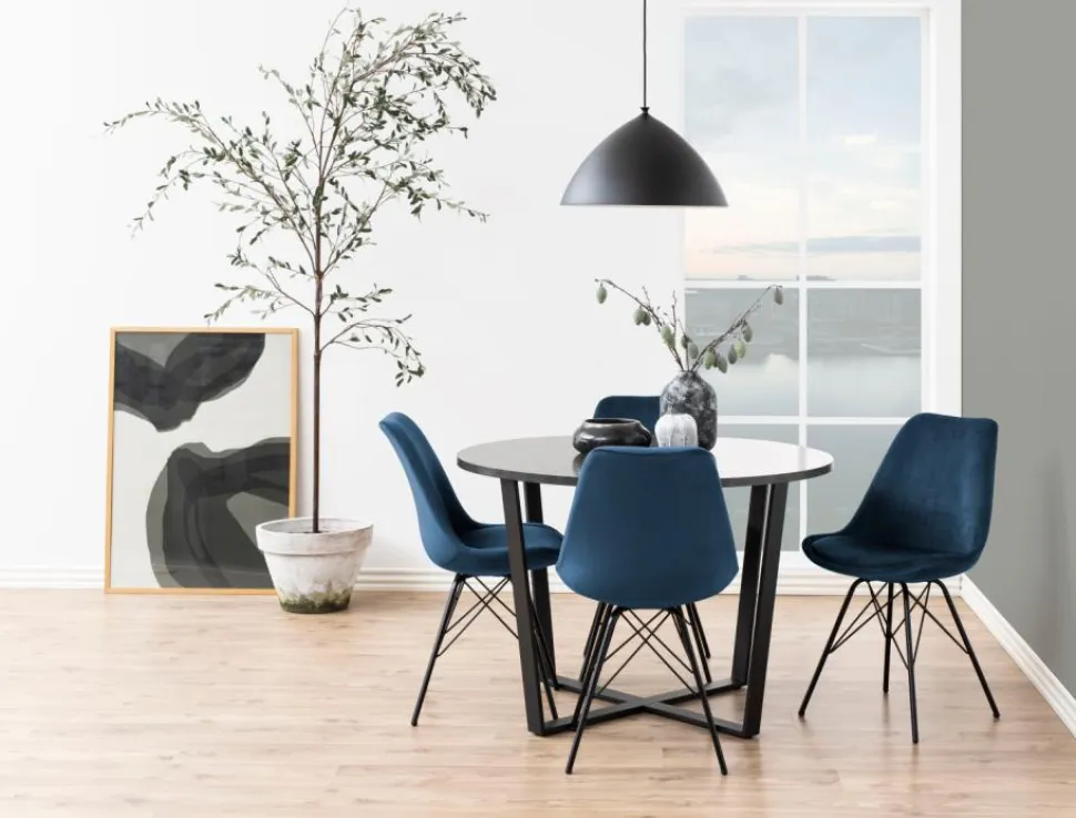 Szukasz rozwiązań, które łączą w sobie funkcjonalność i elegancję?Krzesło Eris VICto mebel, który wyróżnia wyjątkowalekkość i delikatność formy. Jego profilowane siedzisko posiada subtelnie zaokrąglone krawędzie, które pozwalają nawysoki komfort użytkowania. Dzięki temu bez problemu będziesz mógł spędzić przy nim długie godziny przy rodzinnym stole lub podczas pracy przy biurku. Stworzona z polipropylenu forma pokryta została tkaniną VIC Navy Blue 66, która jestniezwykle miła w dotyku, a dodatkowo przez fakturę zbliżoną do weluru przepięknie odbija światło. Subtelność tego wygodnego krzesła podkreśla metalowa podstawa malowana proszkowo w odcieniu eleganckiej czerni. Pomiędzy 4 nogami znajdują się dodatkowe wsporniki, które sprawiają, żekonstrukcja jest stabilna i wytrzymała, przez co może unieść do 120 kg.