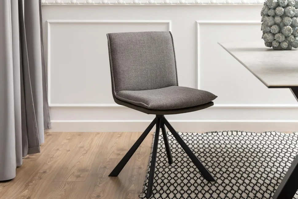 Wyrazisty wygląd krzesła Flynn jest podkreślany przez obrotową podstawę, która nadaje mu nowoczesnego i funkcjonalnego charakteru. Dzięki możliwości obracania, krzesło staje się wszechstronnym meblem, który może być dostosowany do różnych potrzeb i sytuacji. Styl krzesła Flynn jest nowoczesny i idealnie pasuje do współczesnych wnętrz. Jego minimalistyczna forma i staranne wykończenie sprawiają, że jest on doskonałym uzupełnieniem każdej jadalni, nadając jej elegancji i świeżości. Siedzisko mebla zostało tapicerowane antracytową tkaniną z mikrofibry, która posiada specjalną powłokę, nadającą mu surowy wygląd. Ta trwała i łatwa w pielęgnacji tkanina zapewnia nie tylko estetykę, ale także wygodę podczas długotrwałego siedzenia.