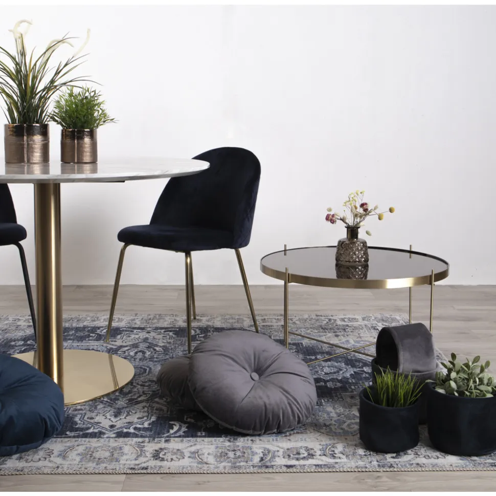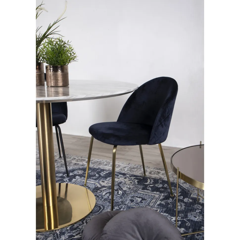 Design krzesła Geneve to połączenie glamour, nowoczesności i skandynawskiej prostoty. Welwetowe siedzisko w kolorze granatowym pięknie kontrastuje z złotą stalową podstawą. Krzesło nie posiada podłokietników, co dodatkowo podkreśla jego minimalistyczny i elegancki wygląd.