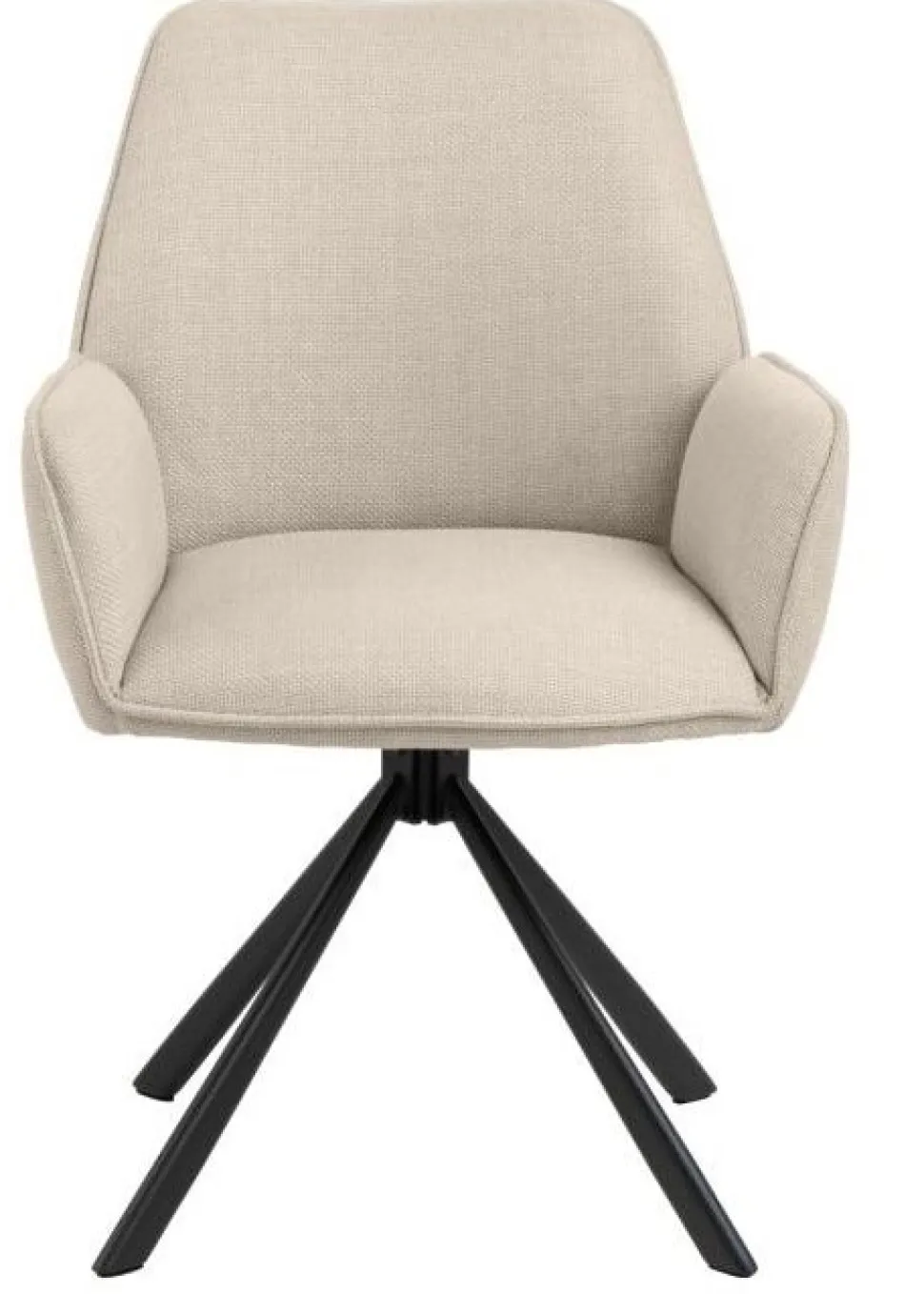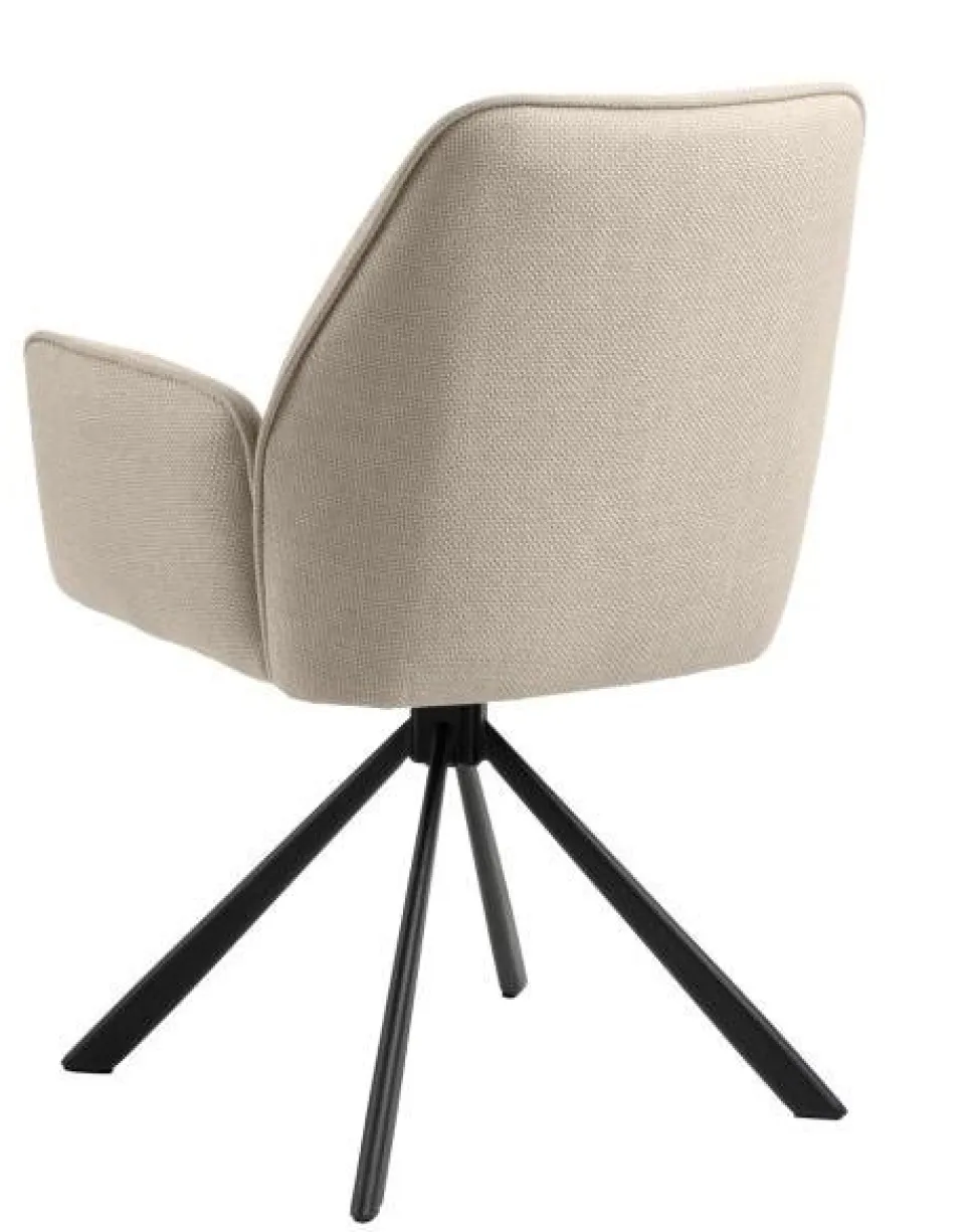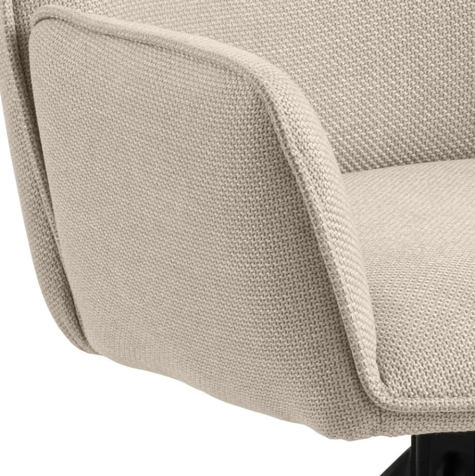 Siedzisko krzesła zostało wykończone interesującą, grubo plecioną tkaniną, która tworzy efekt dwóch odcieni, w zależności od kąta padania światła na mebel. Kolor tkaniny jest ponadczasowy, gwarantując, że krzesło będzie stylowym dodatkiem do wnętrza, który nigdy nie wyjdzie z mody. Dodatkowy element dekoracyjny stanowi gruba lamówka na obrzeżach oparcia, podłokietników i siedziska, nadając krzesłu wyrafinowanego wyglądu. Nowoczesna, czarna podstawa w kształcie 4-gwiazdkowym z obrotowym mechanizmem dodaje nowoczesnego charakteru mebla.