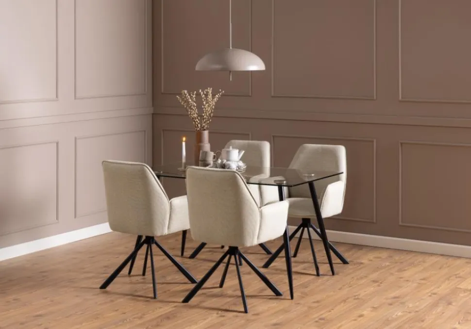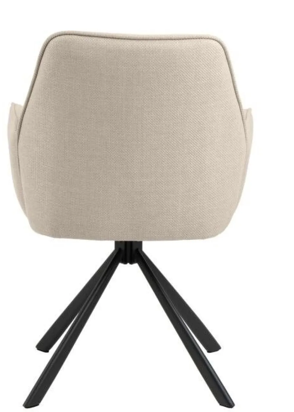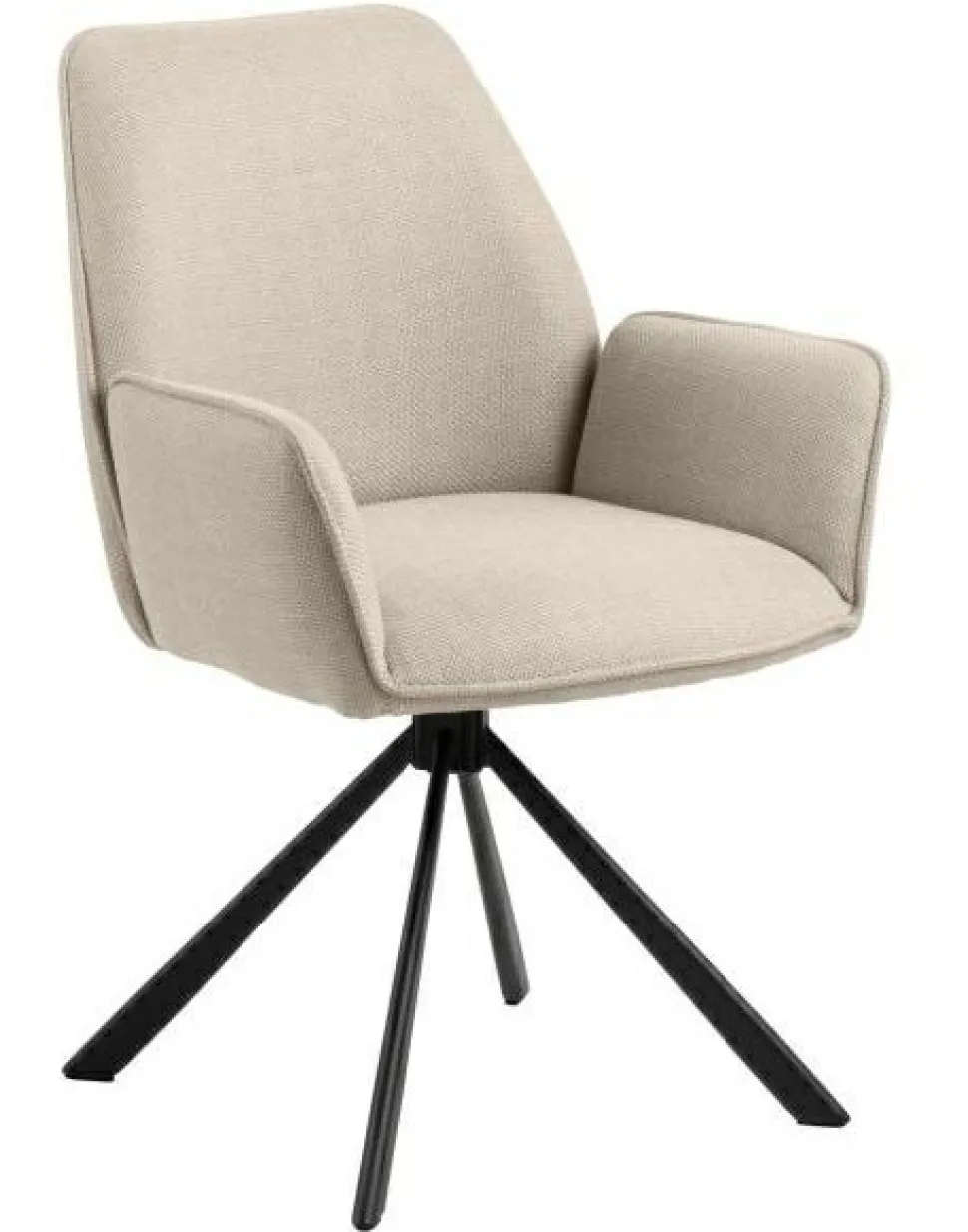 Siedzisko krzesła zostało wykończone interesującą, grubo plecioną tkaniną, która tworzy efekt dwóch odcieni, w zależności od kąta padania światła na mebel. Kolor tkaniny jest ponadczasowy, gwarantując, że krzesło będzie stylowym dodatkiem do wnętrza, który nigdy nie wyjdzie z mody. Dodatkowy element dekoracyjny stanowi gruba lamówka na obrzeżach oparcia, podłokietników i siedziska, nadając krzesłu wyrafinowanego wyglądu. Nowoczesna, czarna podstawa w kształcie 4-gwiazdkowym z obrotowym mechanizmem dodaje nowoczesnego charakteru mebla.