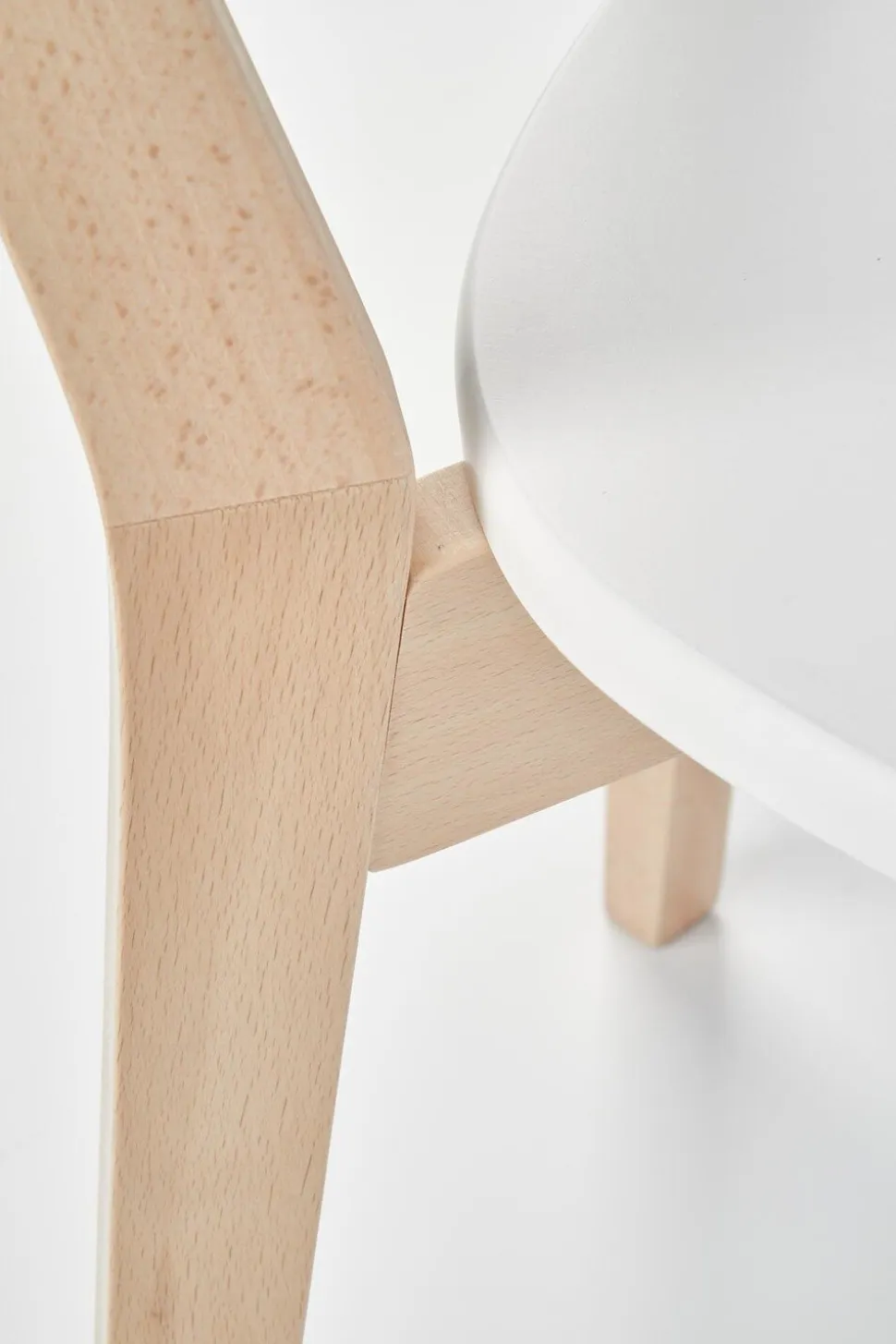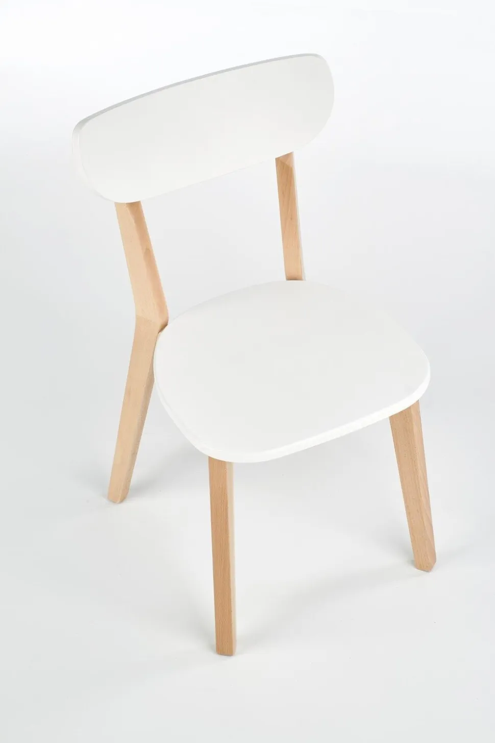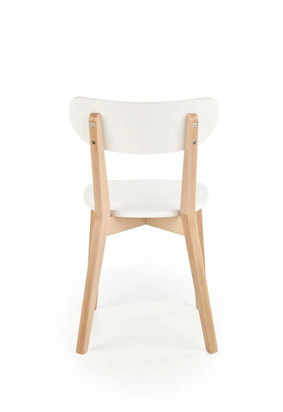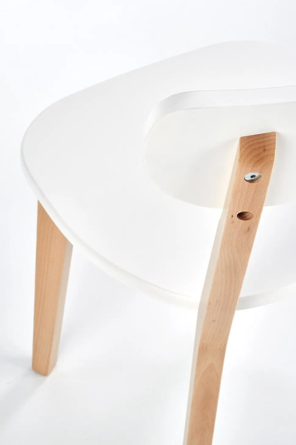 Powierzchnia krzesła została uwydatniona poprzez zastosowanie lakierowanego MDF-u w kolorze białym. To połączenie jasnego drewna z subtelnym, klasycznym białym nadaje meblowi niepowtarzalny charakter. Kolorystyka ta sprawia, że krzesło Guggi doskonale wpisuje się w minimalistyczne aranżacje, dodając im jednocześnie nuty świeżości i delikatności.