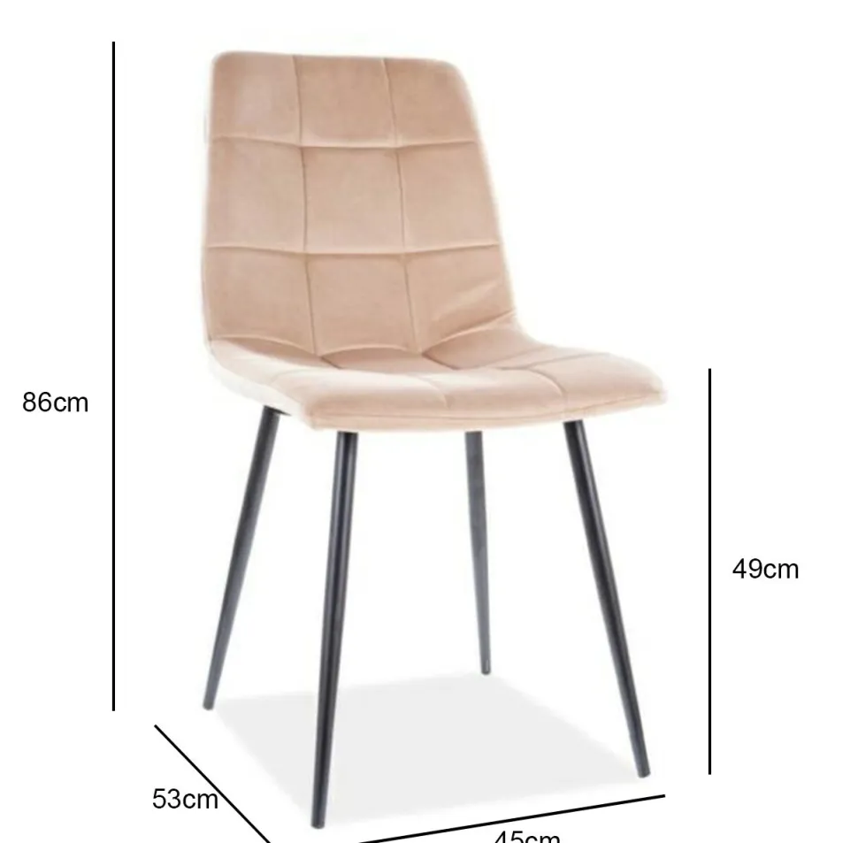 Krzesło Intesi Mello to połączenie niezwykle miękkiej tkaniny welwetowej i metalowych, minimalistycznych nóg. Czarne, malowane proszkowo nogi są wykonane z metalu. Cylindryczny kształt nóg lekko zwęża się w najniższej części mebla. Na uwagę zasługuje ciekawe, minimalistyczne siedzisko krzesła. Siedzisko i oparcie tworzą jedną całość, przez co krzesło jest niezwykle delikatne w swojej formie. Brak podłokietników sprawia, że krzesła mogą być umieszczone przy każdym stole.