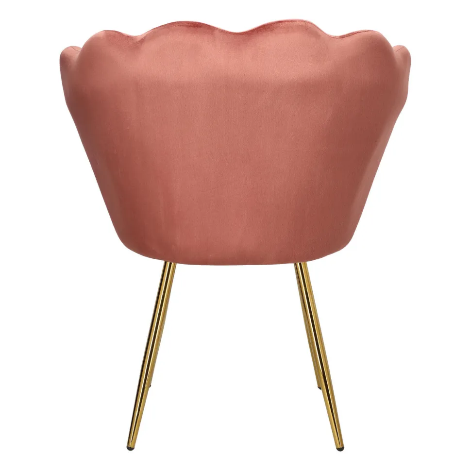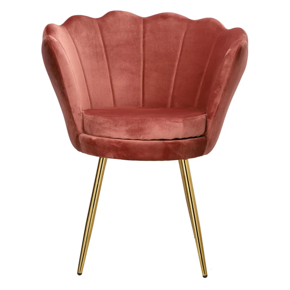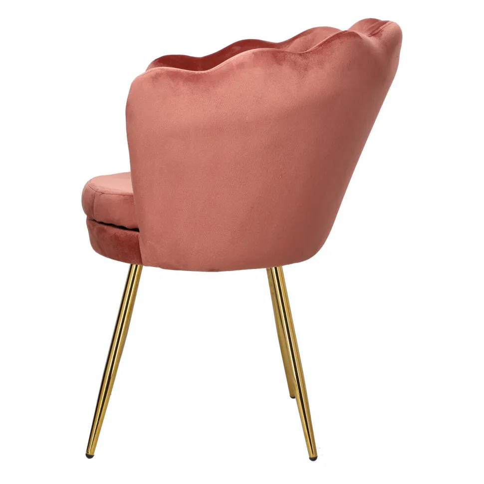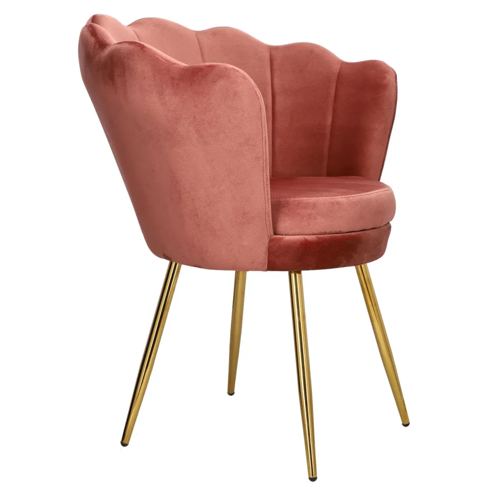Florencja to wyjątkowe krzesło welurowe na złotych nogach, które idealnie wkomponuje się w przestrzeń przy toaletce w stylu glamour. Fotel Muszelka może być także dodatkowym siedziskiem w salonie lub jadalni, gdzie zachwyci gości swoim kształtem. Obszerne siedzisko z miękką poduszką i oparciem przypomina muszlę, która wprowadzi do wnętrza luksus i elegancję. Wypełnione grubą pianką tapicerską siedzisko zapewni komfortowe siedzenie przez długie godziny. Welwetowa tkanina z subtelnymi pionowymi przeszyciami posiada miękką i lekko mieniącą się strukturę co powoduje zarówno przyjemny efekt wizualny, jak i miłe uczucie w dotyku. Jej niebanalny kolor w połączeniu ze złotą podstawą sprawia, że doskonale będzie wyglądać we wnętrzach glamour i retro. Nogi wykonane zostały z metalu pomalowanego na złoty kolor i wykończone na wysoki połysk.