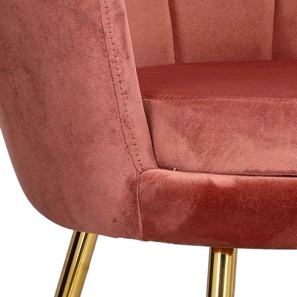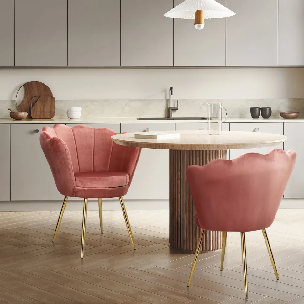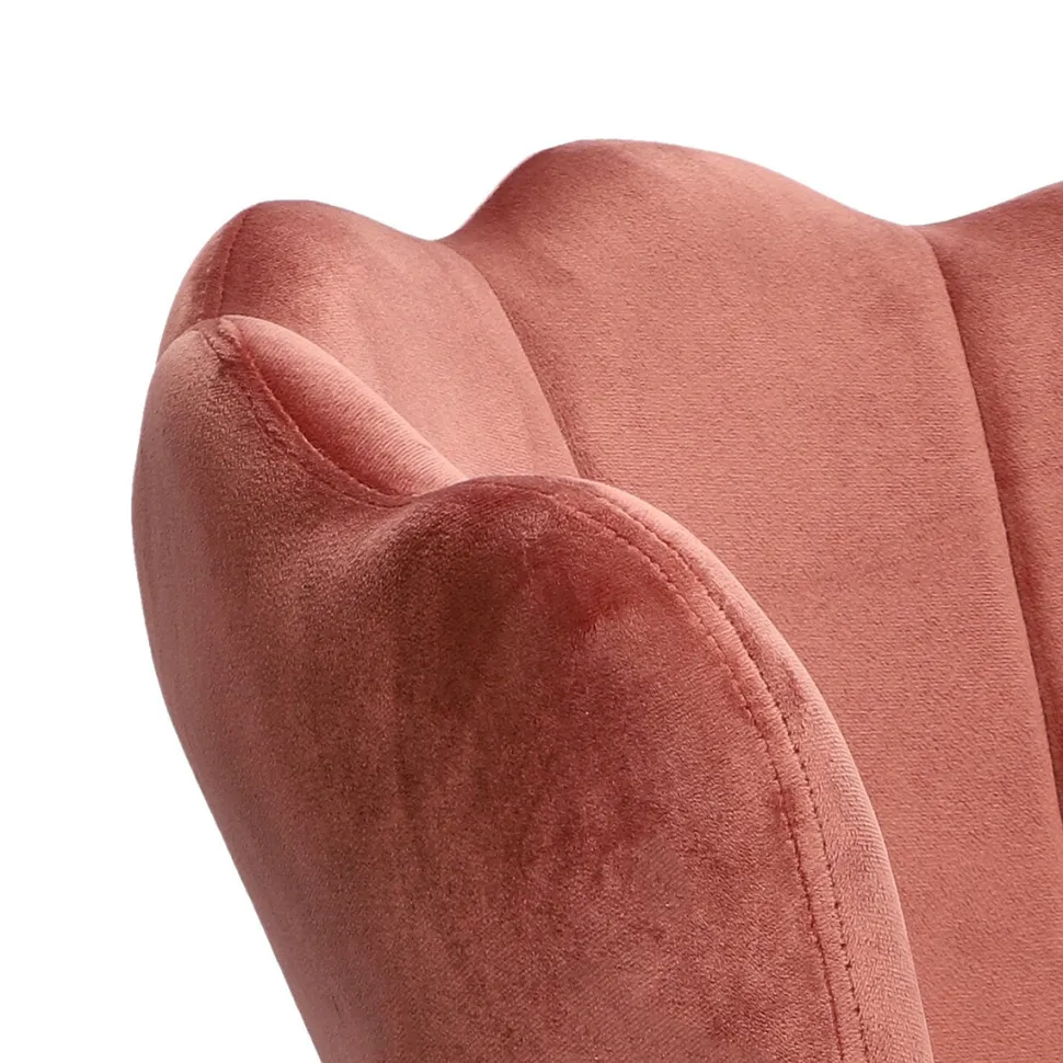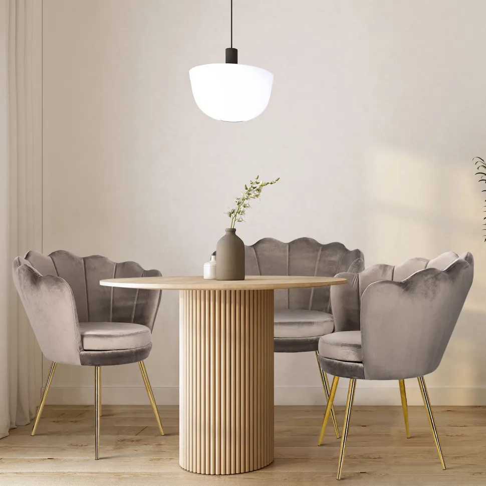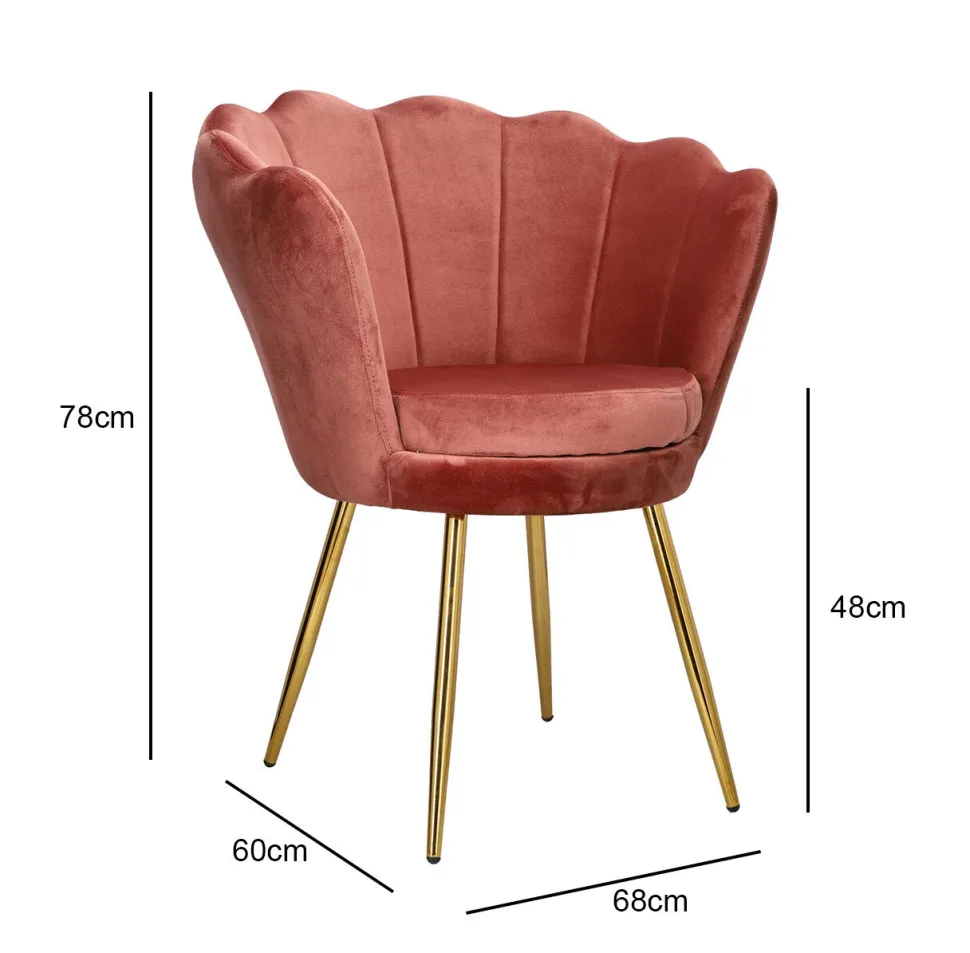 Florencja to wyjątkowe krzesło welurowe na złotych nogach, które idealnie wkomponuje się w przestrzeń przy toaletce w stylu glamour. Fotel Muszelka może być także dodatkowym siedziskiem w salonie lub jadalni, gdzie zachwyci gości swoim kształtem. Obszerne siedzisko z miękką poduszką i oparciem przypomina muszlę, która wprowadzi do wnętrza luksus i elegancję. Wypełnione grubą pianką tapicerską siedzisko zapewni komfortowe siedzenie przez długie godziny. Welwetowa tkanina z subtelnymi pionowymi przeszyciami posiada miękką i lekko mieniącą się strukturę co powoduje zarówno przyjemny efekt wizualny, jak i miłe uczucie w dotyku. Jej niebanalny kolor w połączeniu ze złotą podstawą sprawia, że doskonale będzie wyglądać we wnętrzach glamour i retro. Nogi wykonane zostały z metalu pomalowanego na złoty kolor i wykończone na wysoki połysk.