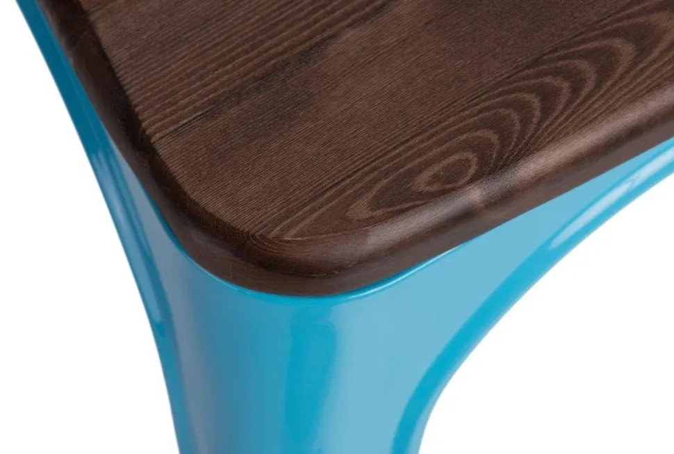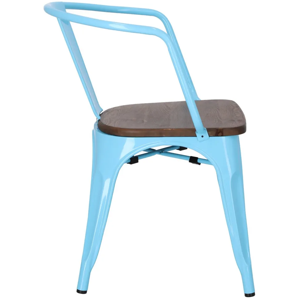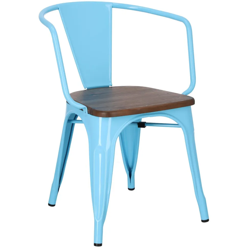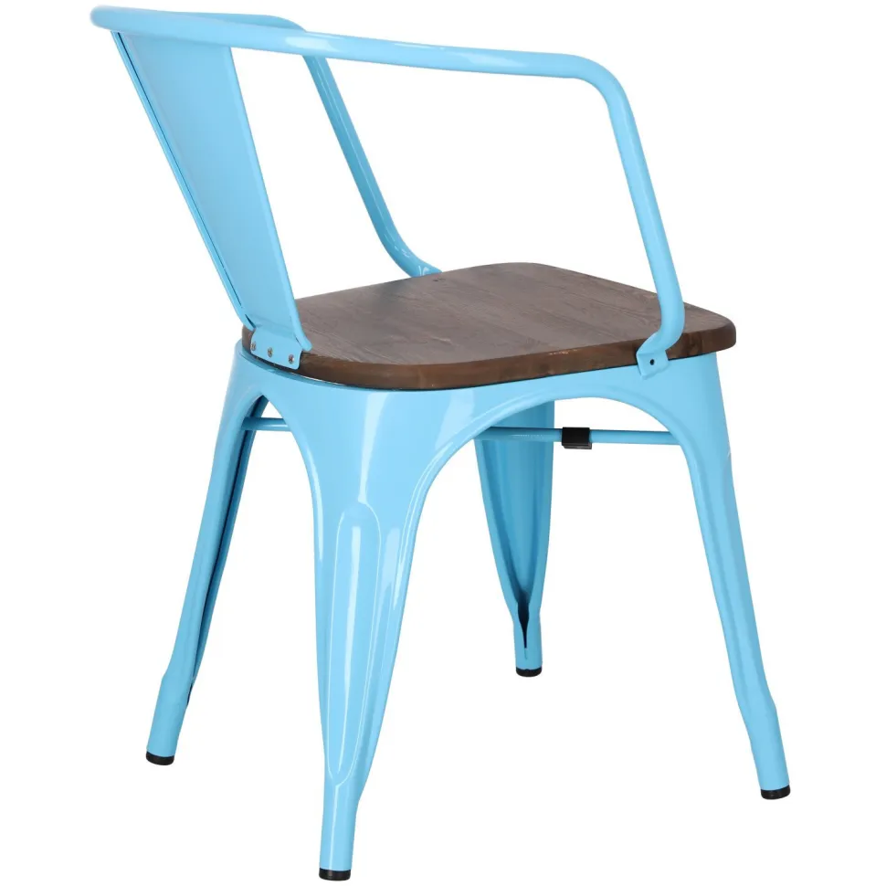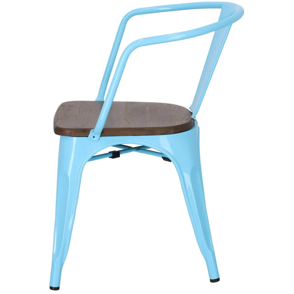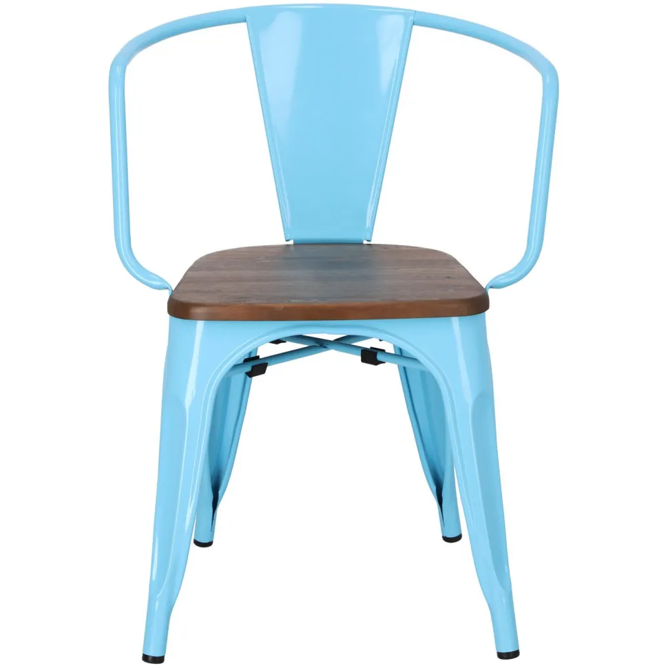 Metalowa konstrukcja, została podkreślona widocznymi elementami spawania, które od razu przynoszą na myśl dźwięki, wydobywające się z hut i starych fabryk. Nogi mebla zostały dodatkowo zabezpieczone gumowymi nakładkami, dzięki czemu pozostaje on stabilny i nie niszczy podłogi podczas przesuwania. Surowy charakter krzesła przełamuje starannie wykonane lakierowane siedzisko z drewna sosnowego w wybarwieniu orzechowym. Jest ono dzięki temu gładkie i łatwe do utrzymania w czystości. Oparcie krzesła posiada charakterystyczny, niepełny kształt podtrzymywany przez cienką, metalową rurkę. Taka rama dodaje z pewnością lekkości, na pozór ciężkiemu industrialnemu meblowi. Krzesło Paris Arms Wood wykonane jest z trwałych materiałów, odpornych na uszkodzenia oraz jest dostępne w kilku atrakcyjnych kolorach, które poszerzają możliwości aranżacyjne, gdyż można je ze sobą dowolnie łączyć i tworzyć niepowtarzalne, przyciągające uwagę kombinacje.