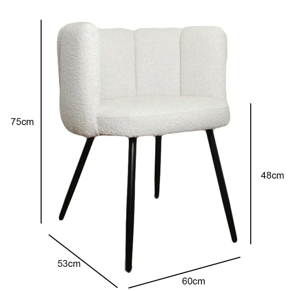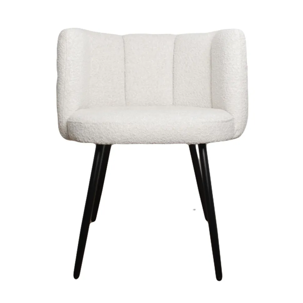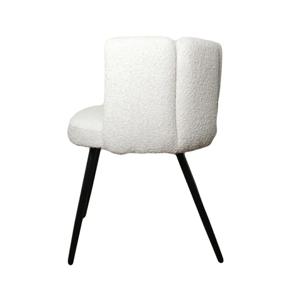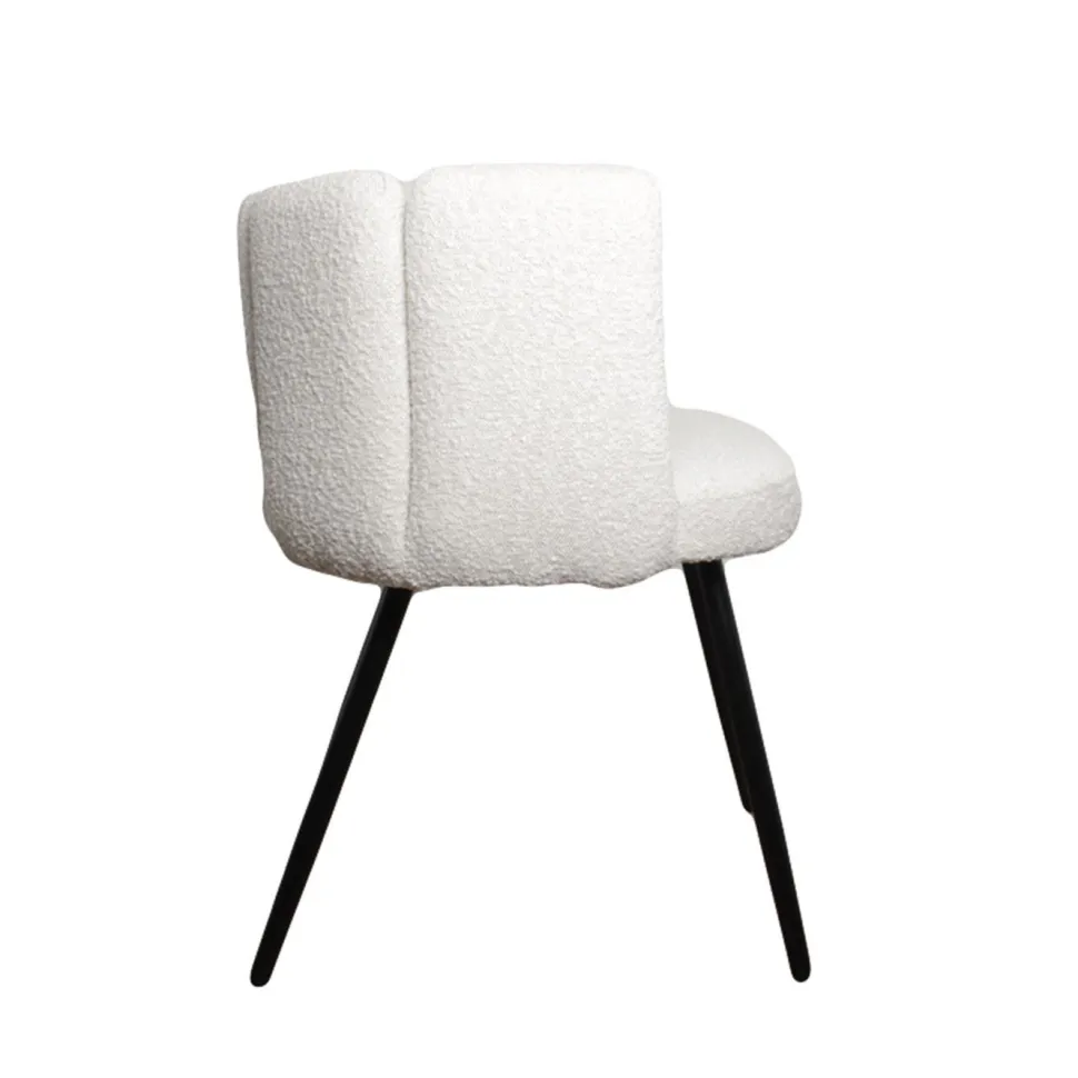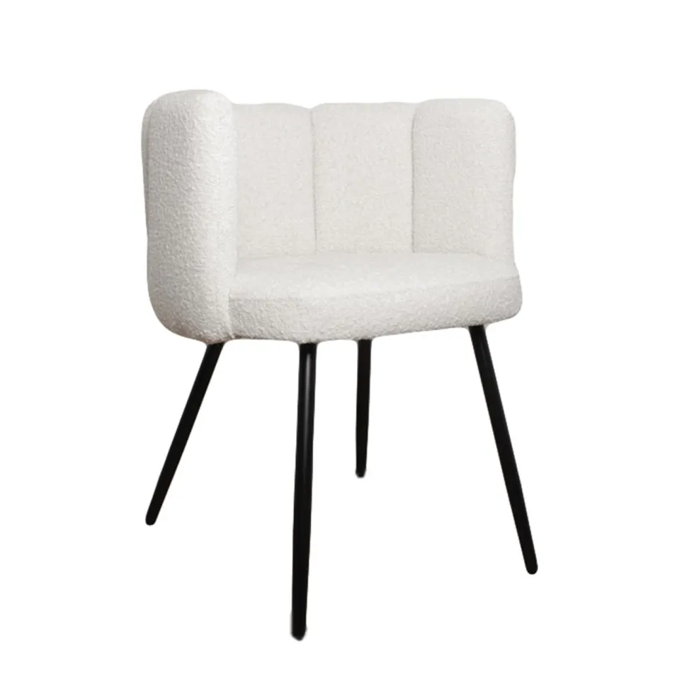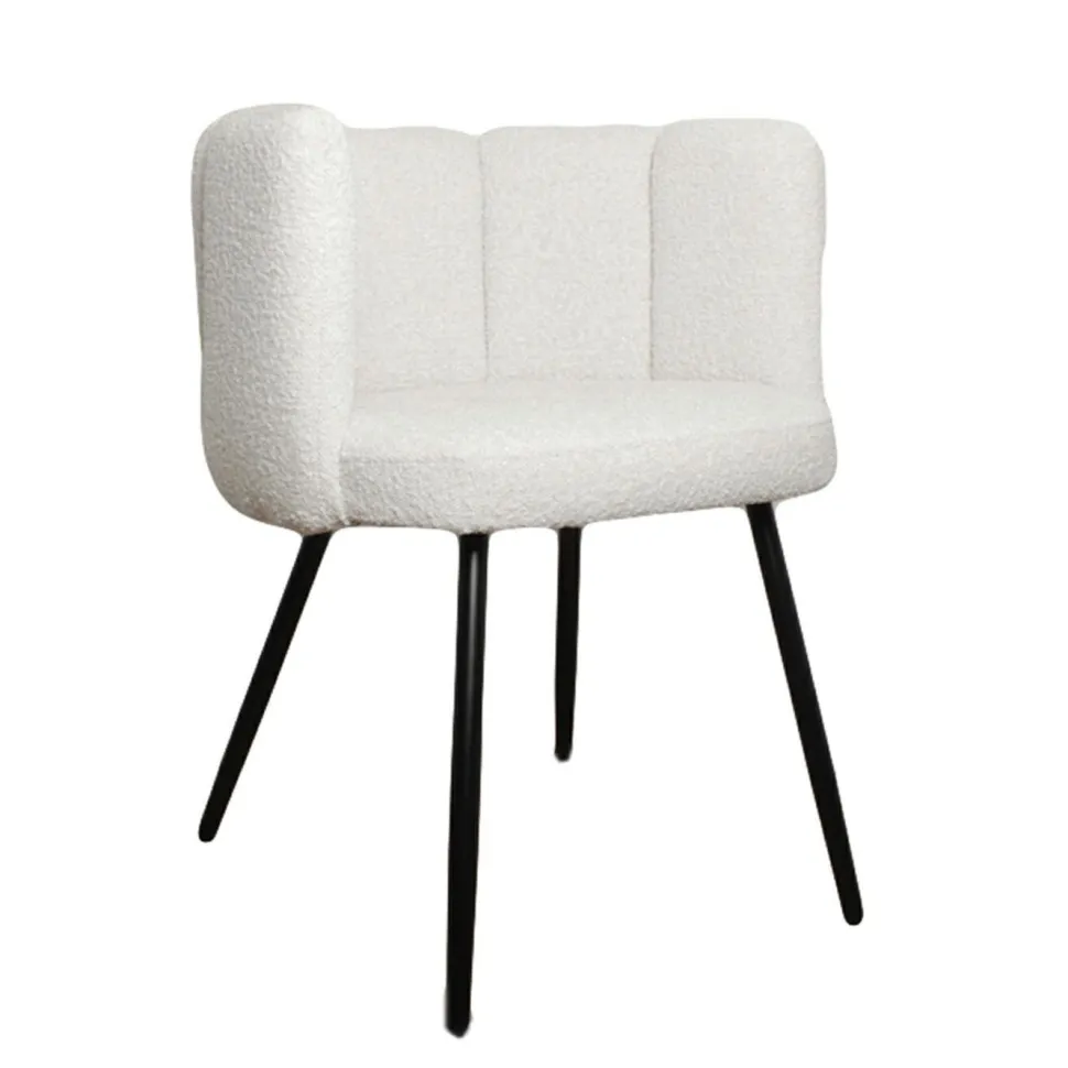 Krzesło Paume o wyrazistej i zarazem przytulnej tkaninie Teddy Bear to mebel, który zachwyci każdego fana dobrego designu. Ten stylowy projekt przypomina pięć uniesionych ku górze palców. Białe miękkie siedzisko składa się z odpornej na uderzenia sklejki i metalowej ramy obitej pianką tapicerską o gęstości aż 25 kg/m3, co wpływa na wysoką jakość komfortu użytkowania. Całość pokrywa puszysta tkanina o śnieżnobiałym perłowym kolorze, który wprowadzi do wnętrza świeżość i blask. Nogi krzesła to metal pomalowany proszkowo na kolor czarny. Paume to przede wszystkim krzesło do salonu, toaletki i biurka. Dzięki swojej designerskiej formie odnajdzie się także w gabinetach, poczekalniach i innych wnętrzach publicznych. Krzesło wymaga montażu.