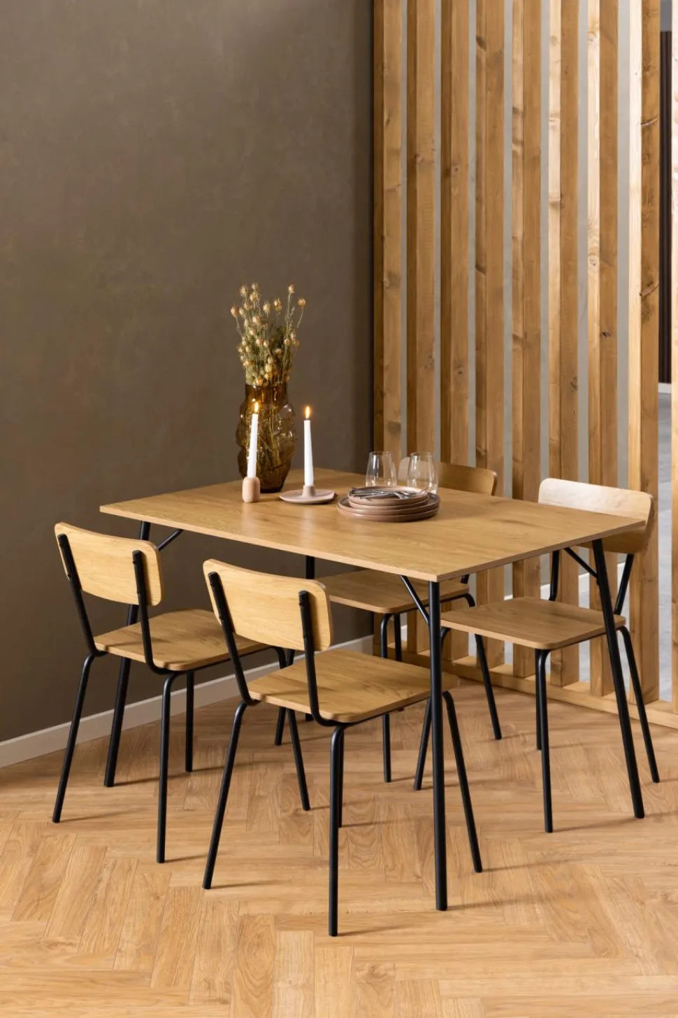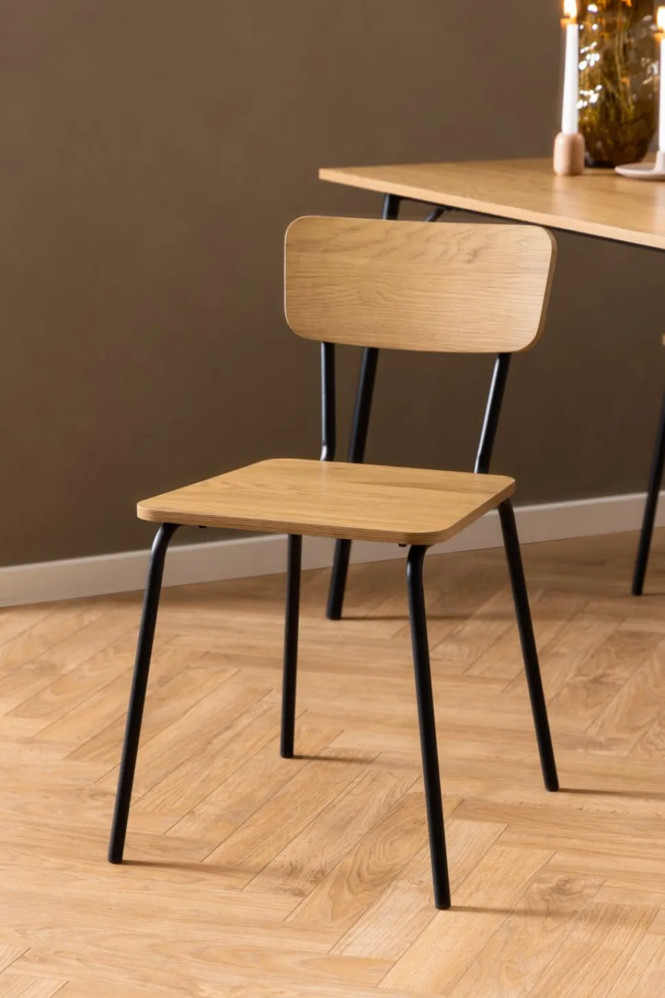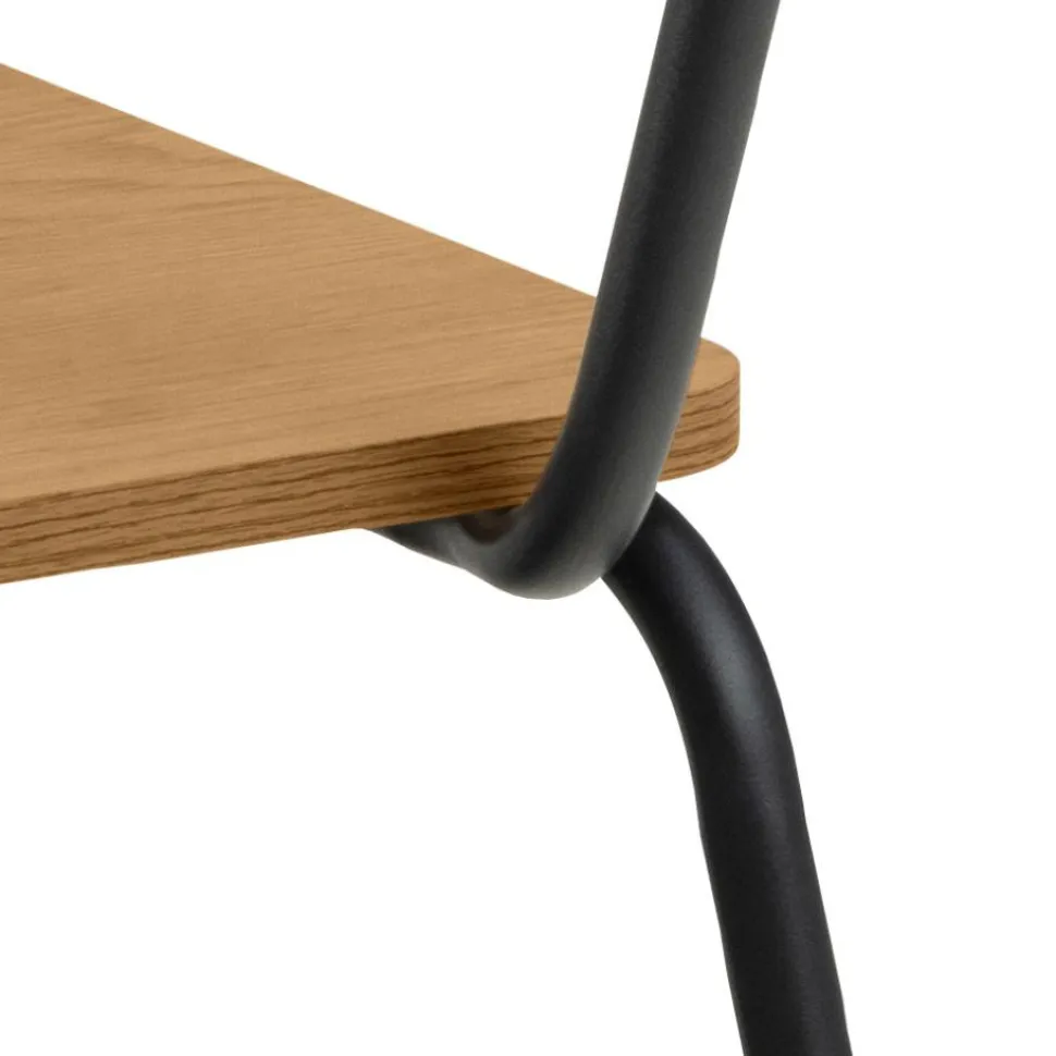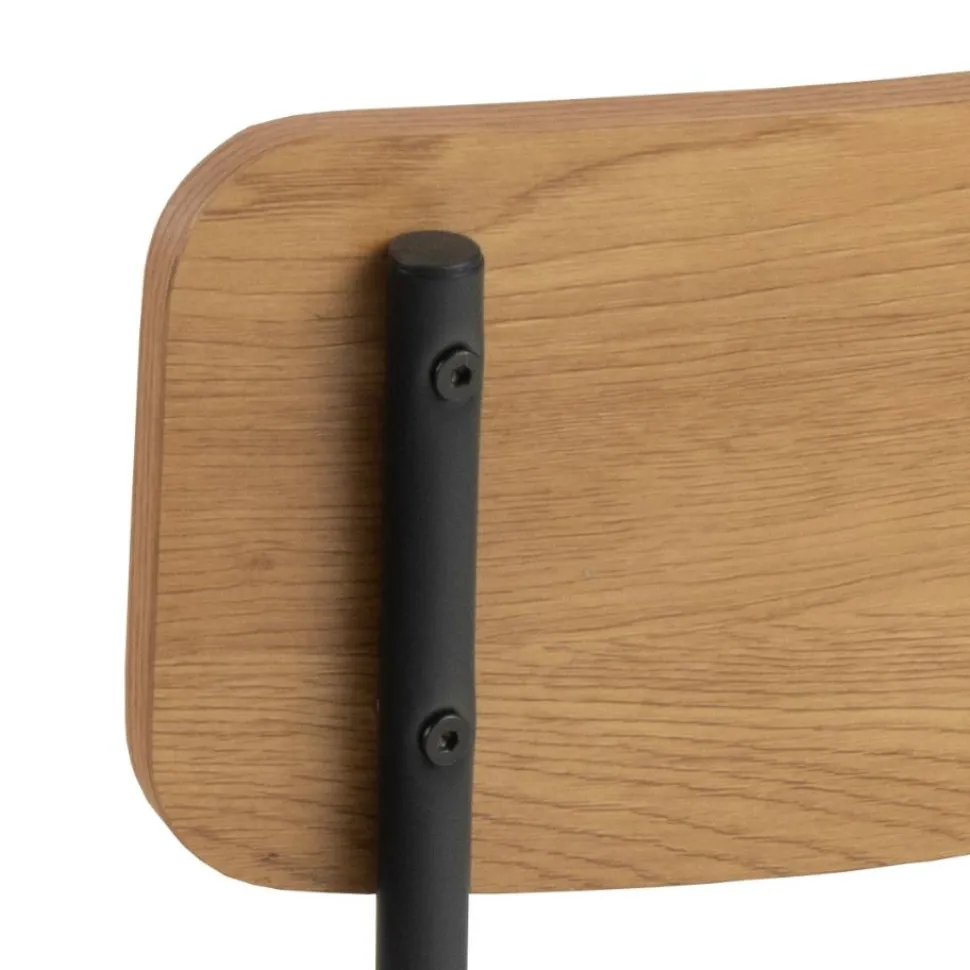 Jego siedzisko i oparcie wykonane z MDF w okleinie imitującej dziki dąb, nie tylko prezentują się pięknie, ale również zapewniają wygodę podczas długich spotkań przy stole. Dzięki temu krzesłu możesz cieszyć się komfortem nawet podczas najdłuższych kolacji czy rodzinnych spotkań. Metalowa podstawa to nie tylko estetyczne uzupełnienie minimalistycznego designu, ale również gwarancja stabilności i trwałości mebla. Nie musisz się martwić o to, czy krzesło wytrzyma intensywne użytkowanie – metalowa konstrukcja zapewnia mu solidność i długą żywotność.