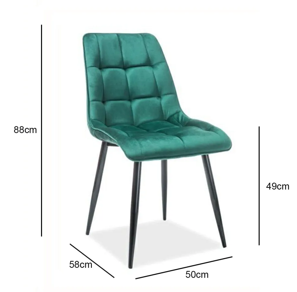 Tapicerowane krzesło z aksamitu w kolorze zielonym z wzorem w kratkę. Regularnie pikowane siedzisko jest niezwykle wygodne i posiada wyprofilowane oparcie. Metalowe, malowane na czarno nogi są odporne na uszkodzenia i zakończone stopkami z tworzywa sztucznego.