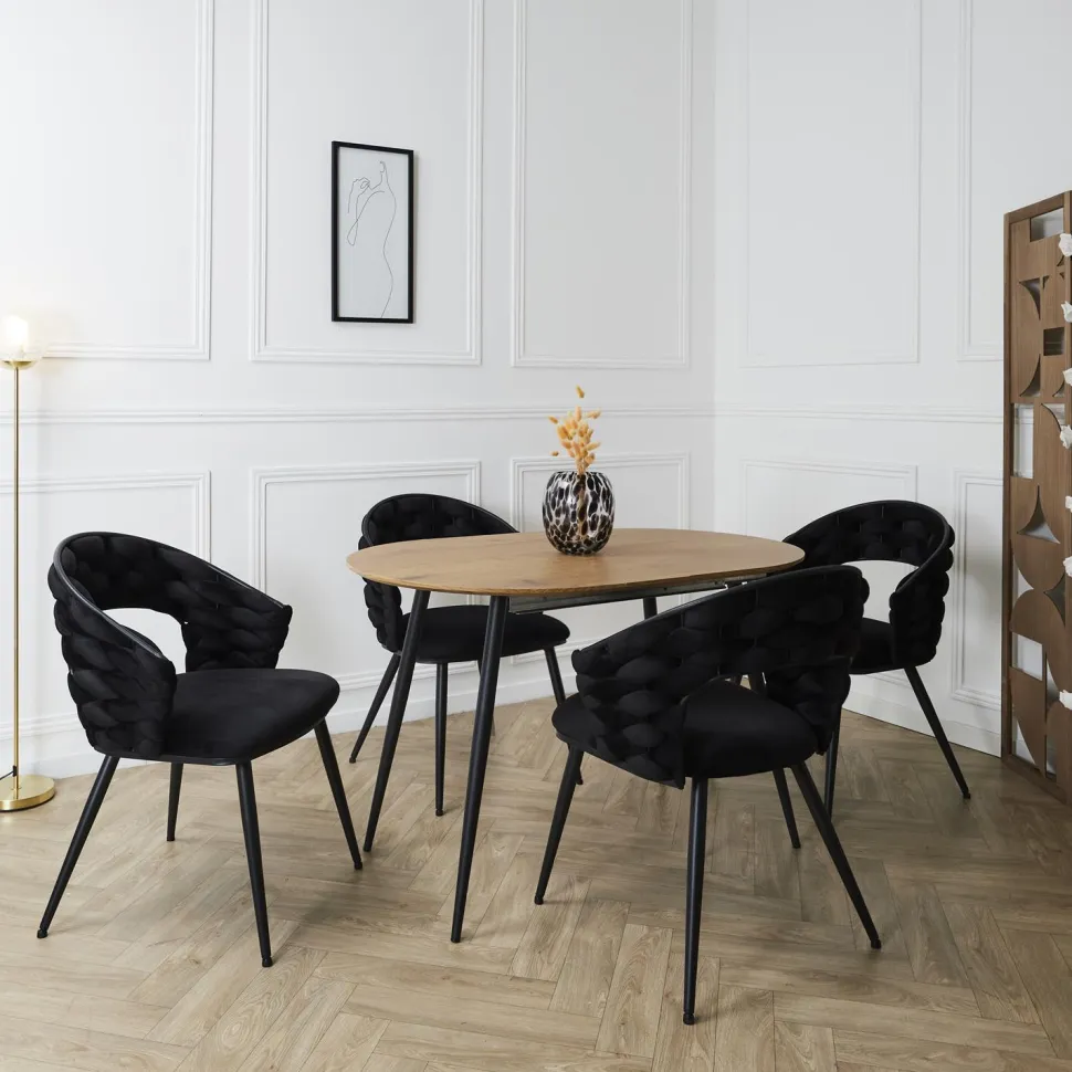 Wyjątkowe krzesło Sawyer, wyróżniające się intensywnym czarnym odcieniem, to połączenie stylu i komfortu. Wykonane z wysokiej jakości materiałów takich jak żelazo, poliester, sklejka i poliuretan, gwarantuje nie tylko wytrzymałość, ale także wygodę użytkowania. Jego nowoczesny design sprawia, że krzesło doskonale wpasuje się w każde wnętrze – od salonu, przez jadalnię, aż po biuro. Stabilne nogi zapewniają funkcjonalność na co dzień.