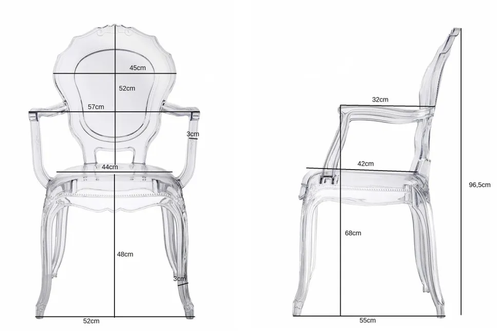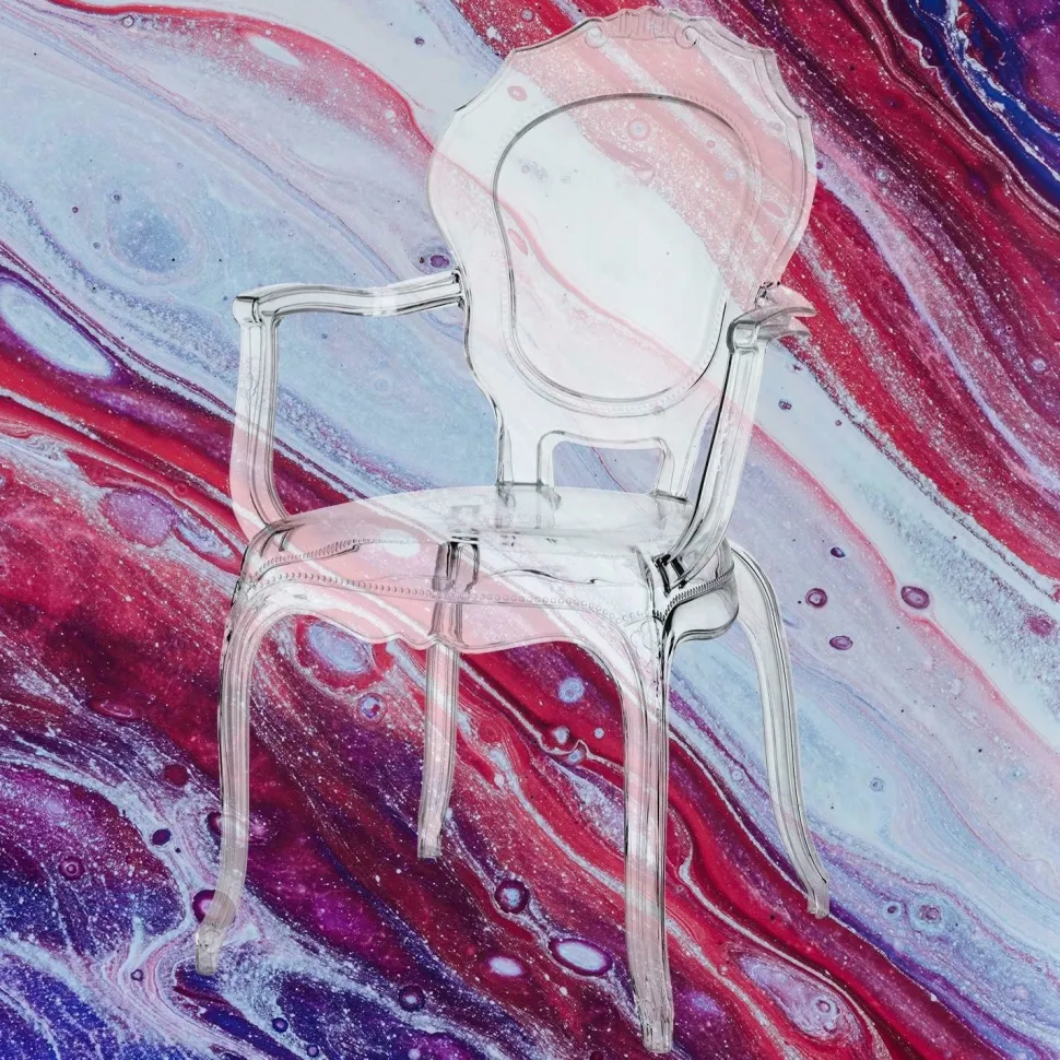 Krzesło transparentne Queen Arm to nowoczesna wariacja na temat mebli w stylu Ludwika XIV. Siedzisko z dekoracyjnymi zdobieniami oraz wygiętymi kabriolowymi nóżkami charakterystycznymi dla francuskiego baroku zyskały dzięki zaawansowanej technologii niebanalne, transparentne oblicze.