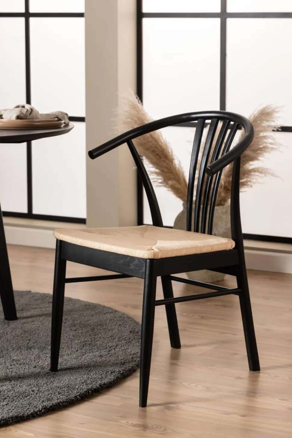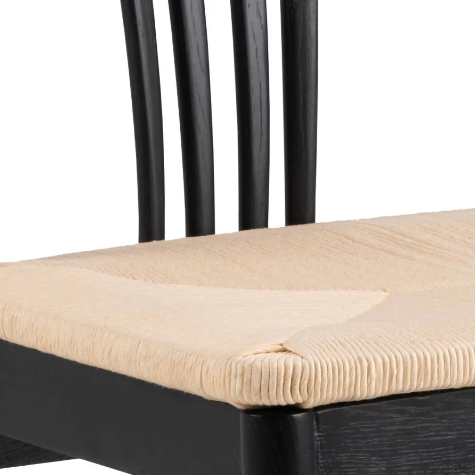 Krzesło do jadalni York z podłokietnikiem, z białą papierową plecionką i matowym czarnym dębem lakierowanym NC, podstawa z matowego czarnego dębu lakierowanego NC, z wzorem koperty. Charakteryzujące się łagodną skandynawską estetyką i naturalnymi materiałami, to krzesło do jadalni z zakrzywionym oparciem może znaleźć swoje miejsce w wielu domach dzięki swojemu klasycznemu wyglądowi. Plecione siedzisko wykonane jest z białej papierowej liny, podczas gdy reszta krzesła wykonana jest z lakierowanego na czarno dębu. Wymaga montażu. Max. obciążenie 110 kg. Waga krzesła 5,3 kg.Wymiary kartonu: 58x75x95 cm