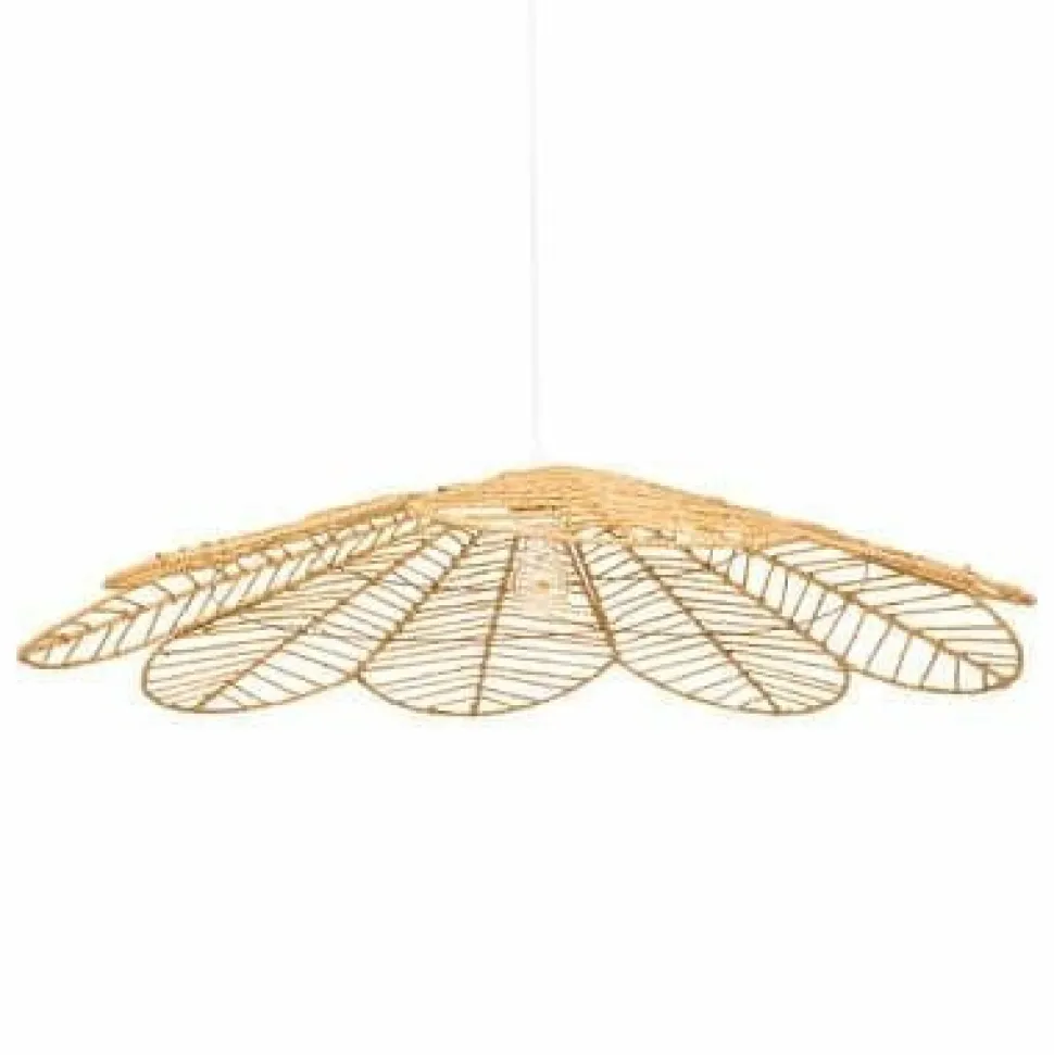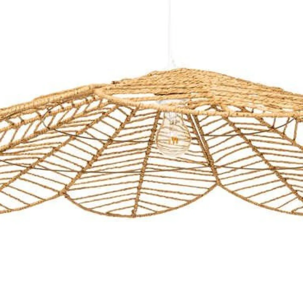 Pleciona lampa o abażurze przypominającym kwiata to naturalny element wystroju wnetrza oraz oświetlenia. Lampa w stylu boho o średnicy 98cm, sprawdzi się jako pojedyńcza lampa nad stołem w jadalni jak i również w kolarzu lamp. Plecionka w naturalnym kolorze umieszczona została na metalowym stelażu. Lampa posiada przewód o długości 90cm. Przewód jest regulowany. Gwint żarówki to E27, natomiast maksymalna moc 40W. Waga lampy 1kg.