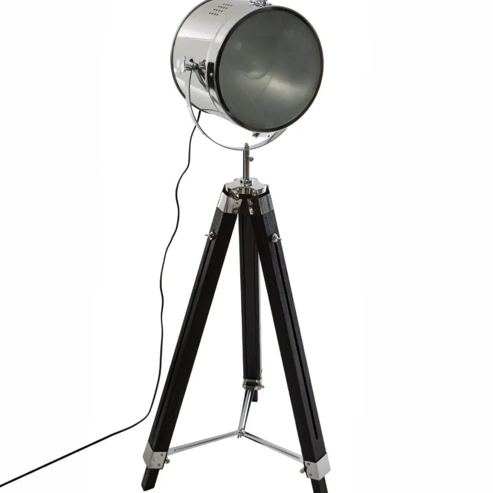 - Metalowy reflektor w kolorze chromu kontrastuje z drewnianymi nogami, tworząc efektowną całość.