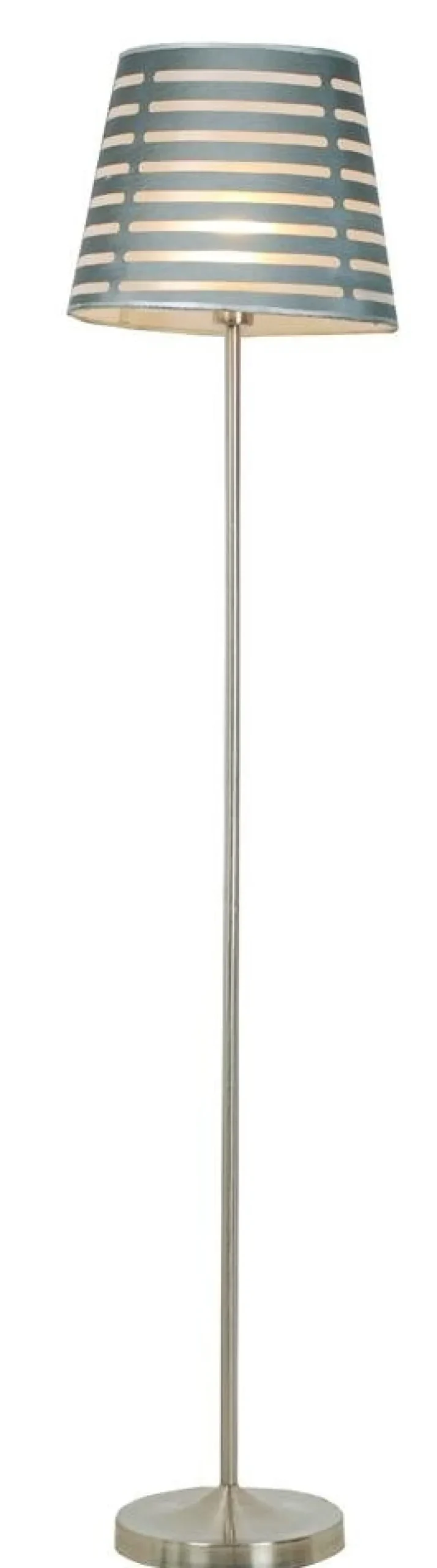 - Posiada metalową podstawę w satynowym wykończeniu oraz szary abażur z dekoracyjnymi wycięciami.