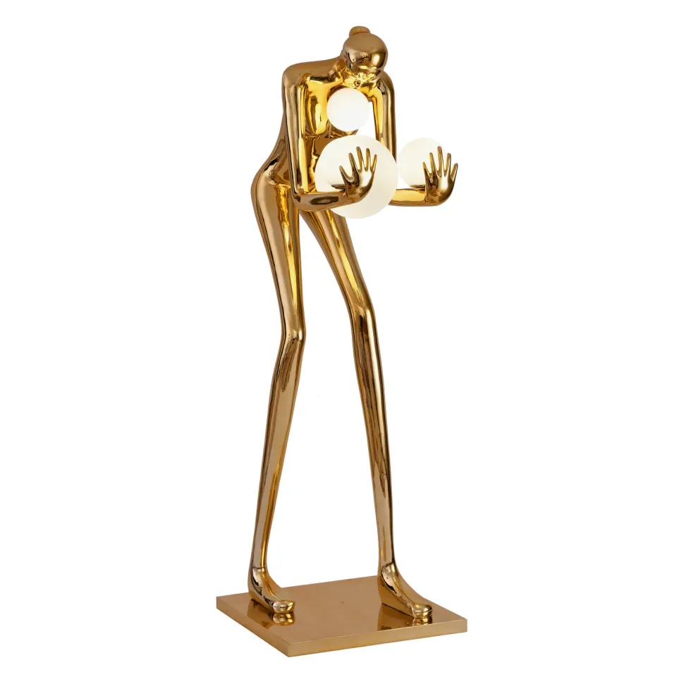 WOMAN-2 GOLD to unikalna lampa podłogowa, której design nawiązuje do elegancji i luksusu. Wyjątkowość tej lampy podkreśla jej forma, przedstawiająca kobietę niosącą cztery szklane klosze. Całość wykonana jest z tworzywa sztucznego pokrytego lustrzaną, złotą powłoką, która dodaje lampie blasku i podkreśla jej wyjątkowy charakter.