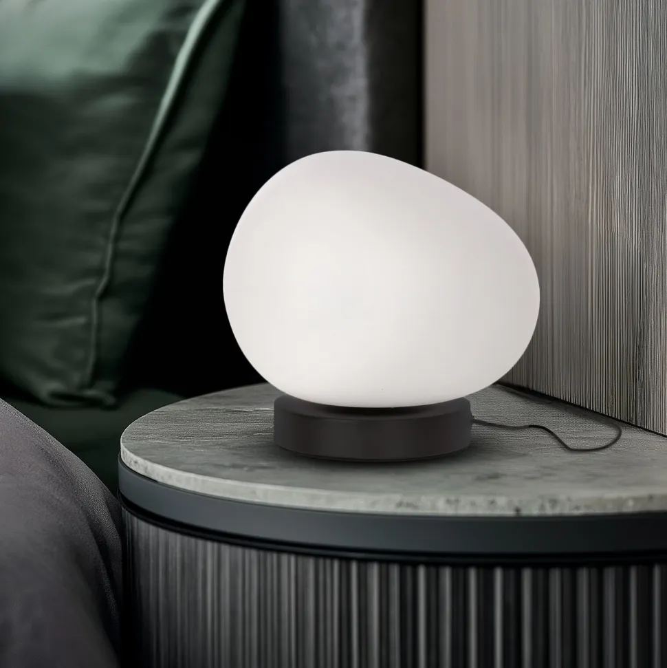 STONES to lampa stołowa, która łączy w sobie nowoczesny design z funkcjonalnością. Czarna podstawa kontrastuje z białym kloszem, tworząc elegancką i stylową całość. Dzięki możliwości wykorzystania żarówek o różnej mocy, lampa pozwala na dostosowanie intensywności światła do Twoich potrzeb.