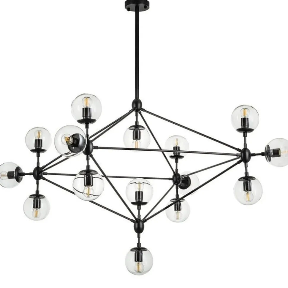 ASTRIFERO-15 to lampa wisząca o przemyślanym designie, który łączy w sobie elementy stylu industrialnego, loftowego i nowoczesnego. Unikalny kształt lampy, przypominający figurę molekularną, sprawia, że staje się ona centrum uwagi w każdym pomieszczeniu. Solidny, metalowy stelaż na planie trójkąta tworzy kontrast z delikatnymi, przezroczystymi kloszami wykonanymi ze szkła. To połączenie daje efekt ciekawego, nowoczesnego wyglądu.