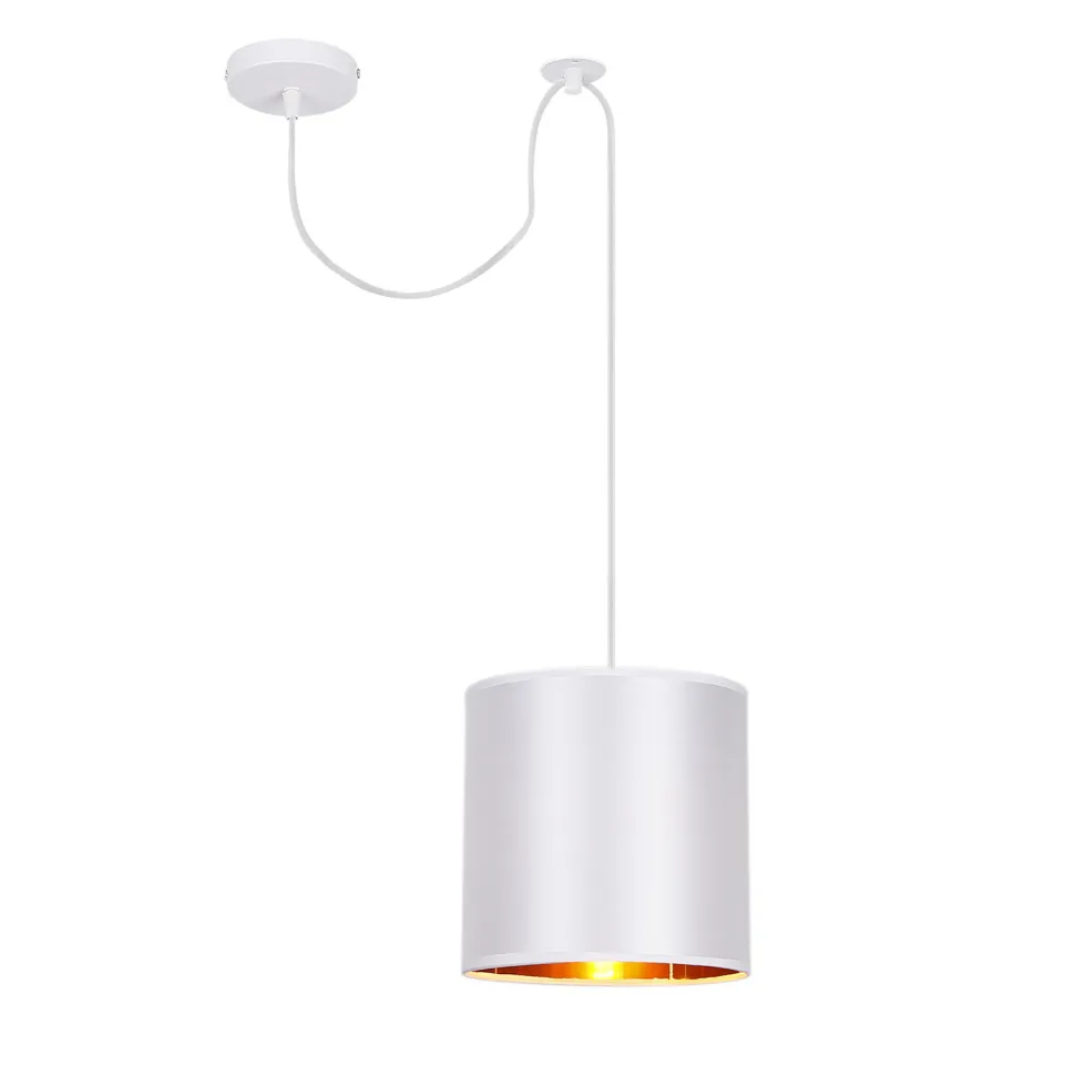 Na białej, matowej, metalowej podstawie umieszczony jest biały przewód zakończony źródłem światła osłonięty ozdobnym, białym kloszem wykonanym z tkaniny i wzmocnionym PCV. W lampie zastosowano oprawkę na żarówkę E27 najczęściej wybieraną i cenioną przez Klientów z uwagi na szeroki wachlarz żarówek możliwych do zastosowania, w tym żarówek LED. Możliwość regulacji długości lampy poprzez skrócenie przewodu daje duże możliwości zastosowania. Może być głównym źródłem światła w niedużym pokoju, sypialni, kuchni, korytarzu jak również w przypadku zastosowania kilku lamp obok siebie – świetnym rozwiązaniem do oświetlenia stołu w jadalni lub barku w kuchni. Rodzina Atlanta składa się z kinkietu, lamp na 1, 2 i 3 źródła światła. Na zdjęciu widoczny abażur po podświetleniu – jest on całkowicie biały.