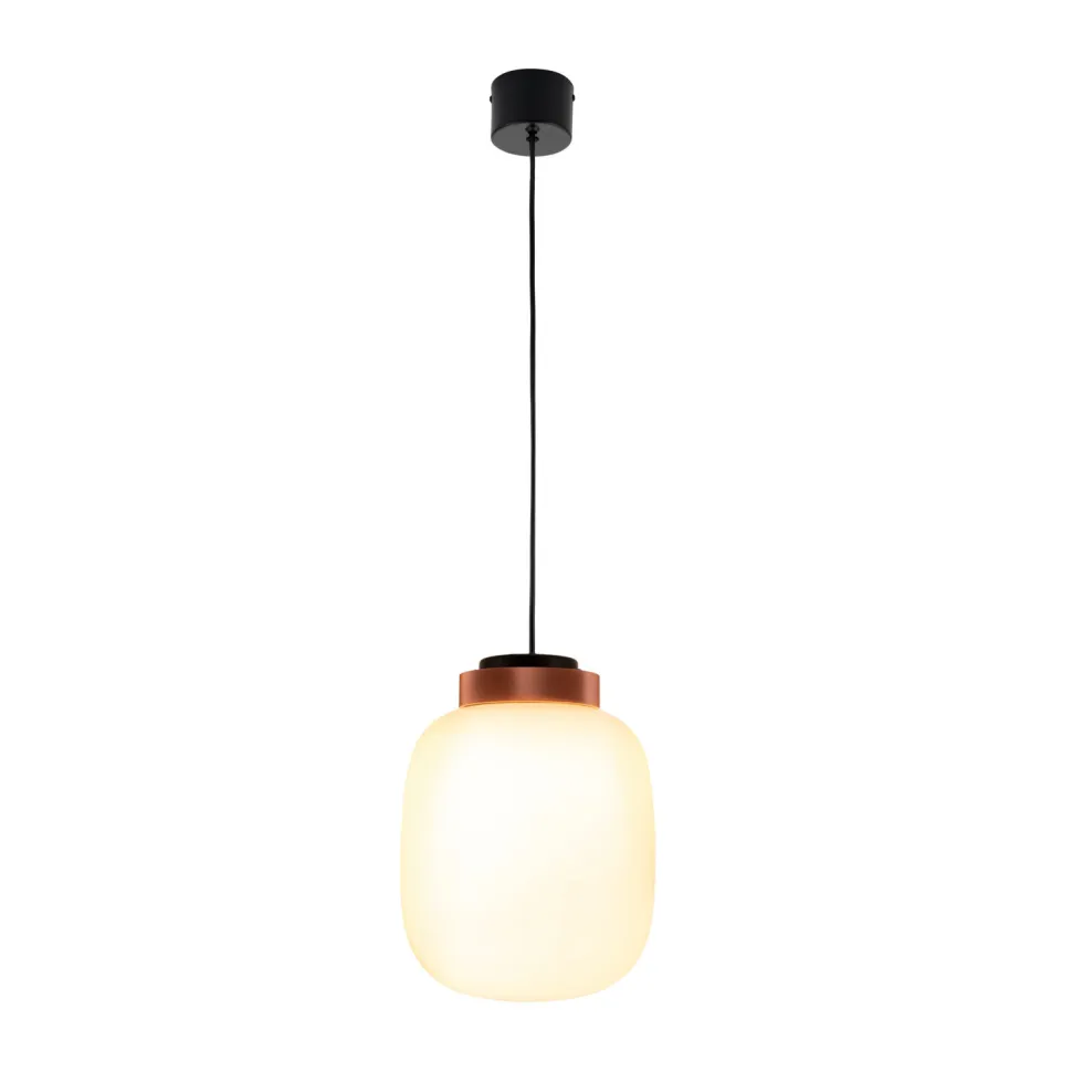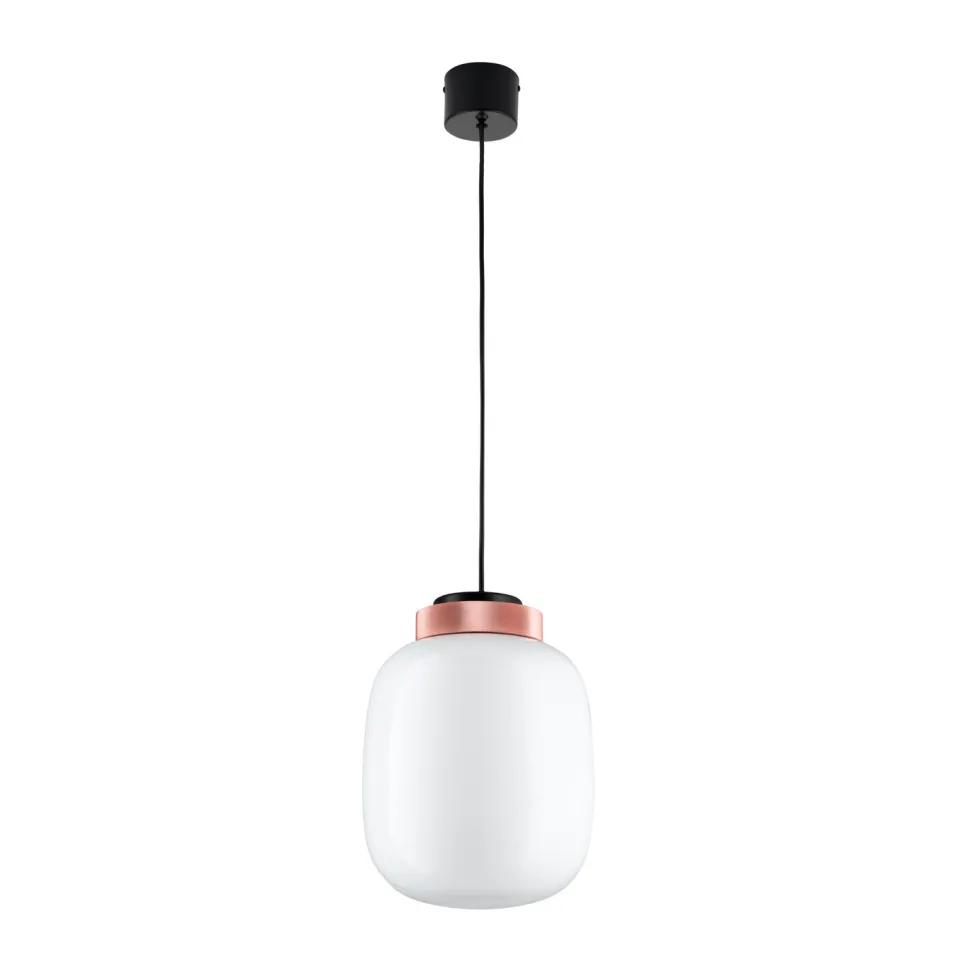 Szklany klosz BOOM w kolorze mlecznym zwieńczony jest dekoracyjnym złotym pasem o geometrycznej strukturze.