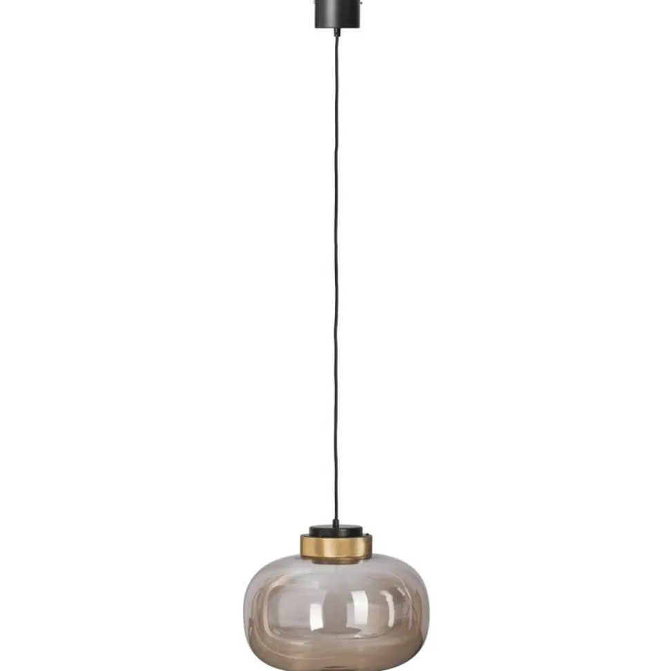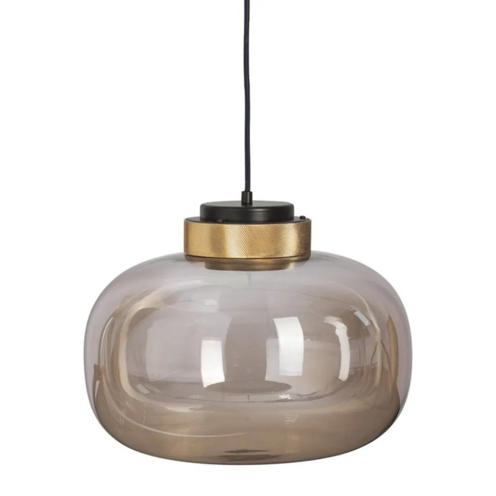 Szklany klosz w kolorze bursztynowym zwieńczony jest dekoracyjnym złotym pasem o geometrycznej strukturze.