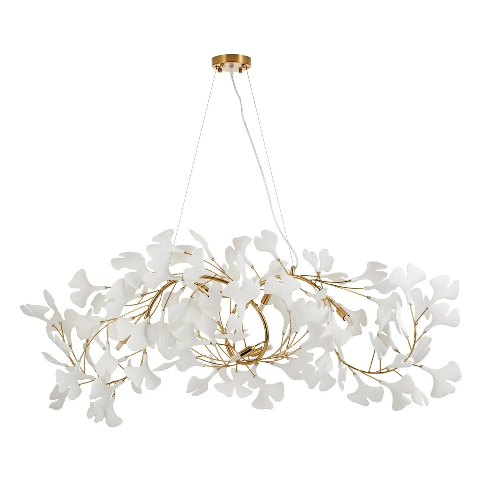 Inspiracją dla lampy wiszącej BOTANIKA WAVE była natura. Jej unikalny design nawiązuje do roślinnych kształtów, co czyni ją wyjątkową dekoracją każdego wnętrza. Biała ceramika z matowym wykończeniem, z której wykonane są listki lampy, idealnie kontrastuje z metalowym stelażem w kolorze polerowanego złota. Dzięki swojemu wydłużonemu kształtowi, lampa będzie wyglądała efektownie nad stołem w jadalni czy recepcji.