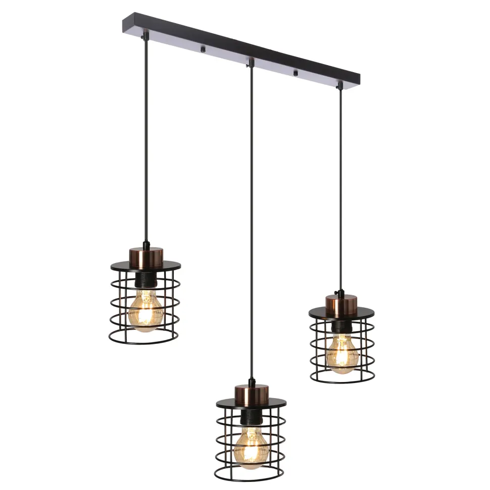Podkreśl wyjątkowy charakter swojego wnętrza za pomocą lampy wiszącej Glob. Ta lampa, z trzema koszyczkami w formie metalowych szkieletów, dodaje nowoczesnego akcentu do każdego pomieszczenia. Klosze w kolorze czarno-miedzianym są umieszczone na eleganckiej czarnej listwie, co dodaje lampie wyrafinowanego wyglądu. Dzięki trzem oprawkom E27, masz możliwość wyboru żarówek według własnych preferencji, co pozwala na dostosowanie natężenia światła do Twoich potrzeb.