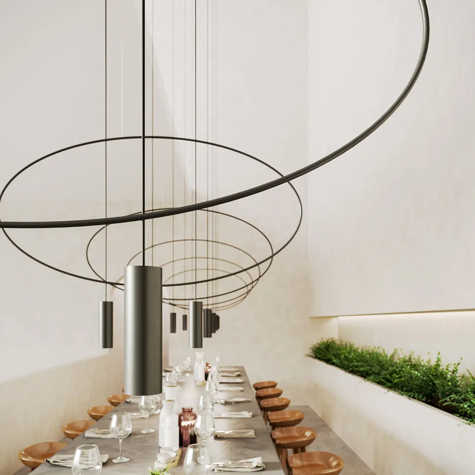 Lampy z kolekcjiHolar będą wyglądać pięknie zarówno pojedynczo jak i w większych konfiguracjach. Uwolnij swoją kreatywność i stwórz kompozycję, która przywiedzie na myśl artystyczne instalacje. Łącząc różne rozmiary oraz kształty — owalnej lampy wiszącej Holar z kwadratowym kształtem lampy Rana — sprawisz, że pod Twoim sufitem powstanie przestrzenna rzeźba. Geometryczne linie lamp wyrysują wspólnie ciekawe kształty, które w subtelny sposób podkreślą charakter wnętrza.