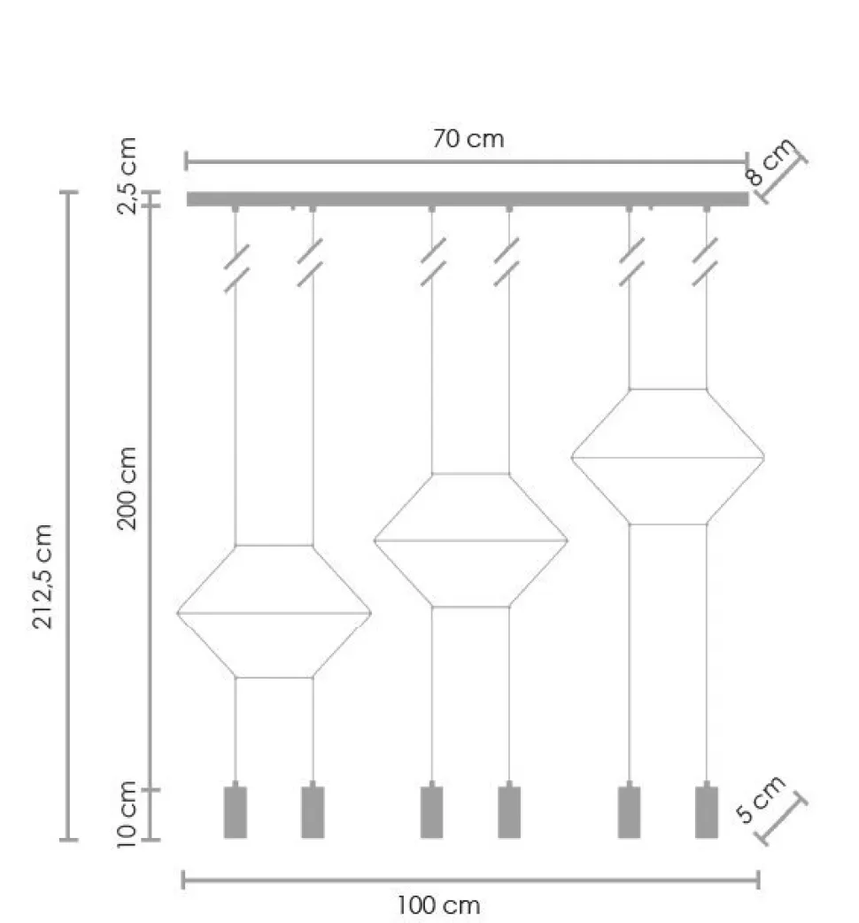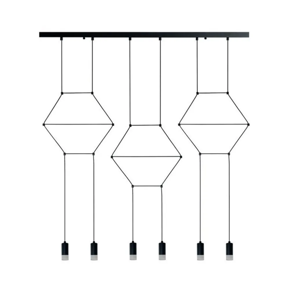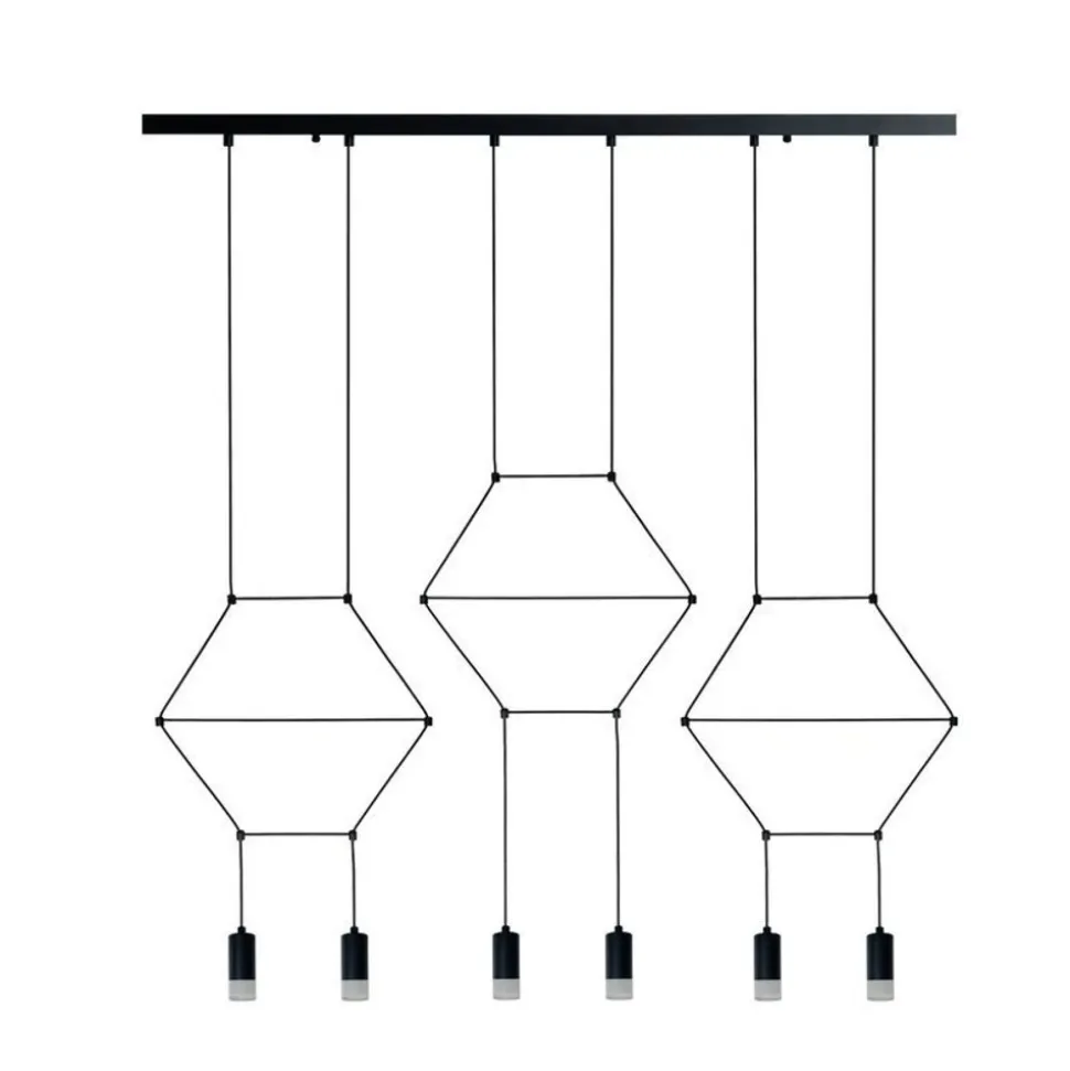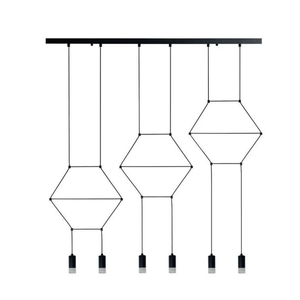 Lampa wisząca z serii LINEA-6 LONG to minimalistyczna forma o geometrycznym kształcie zawieszona na długiej listwie podsufitowej. Kształt Heksagonów uzyskujemy dzięki metalowym poprzeczką, dzięki którym w odpowiedni sposób kształtujemy przewód lampy. Każde z 3 ramion lampy składa się z 2 przewodów oraz trzech metalowych poprzeczek o wymiarach: 17 cm, 37cm i 17 cm. Lampa LINEA-6 LONG składa się z 6 metalowych opraw oświetleniowych w kolorze czarnego matu wykończonego transparentnym kloszem.