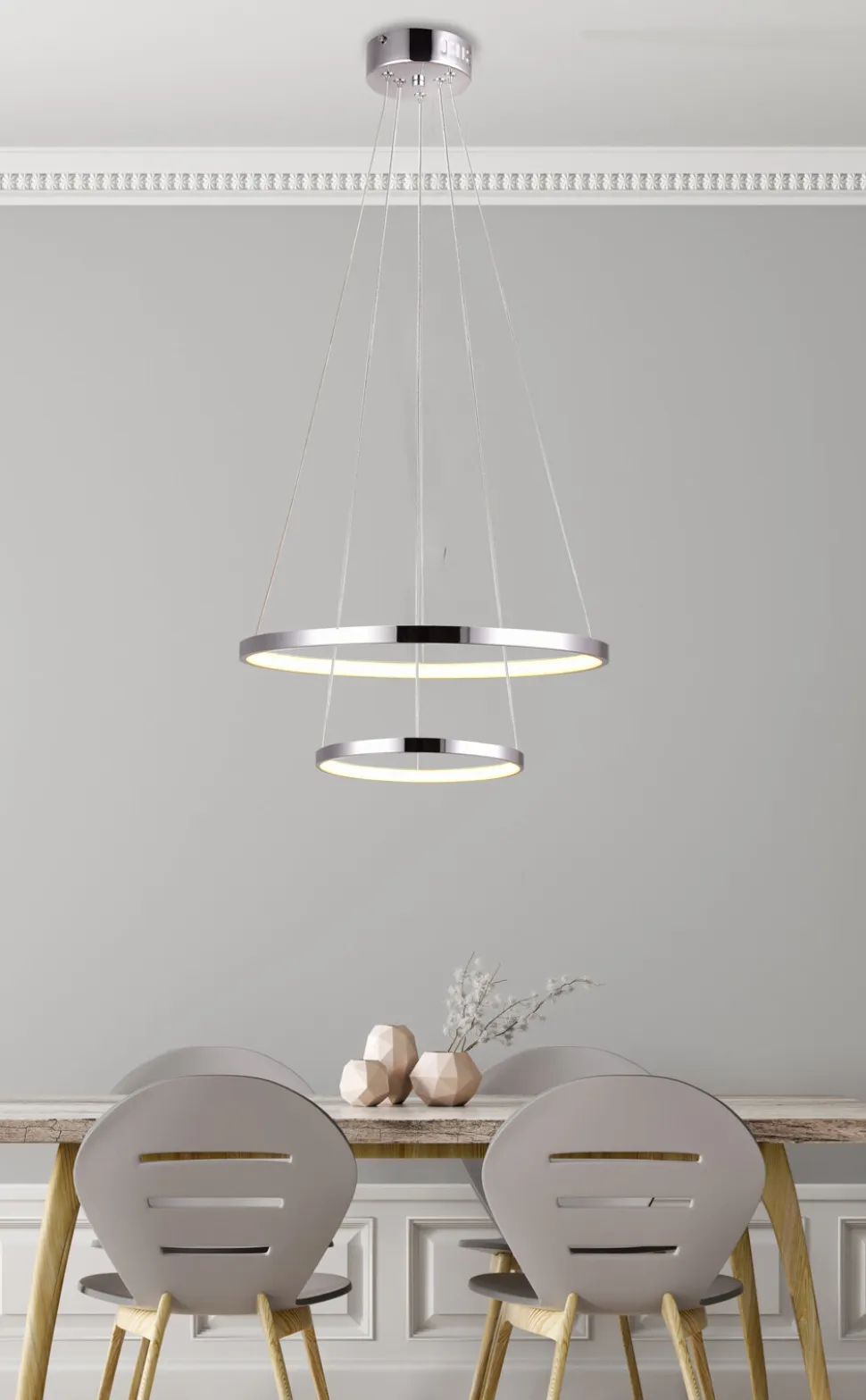 - Chromowany kolor dodaje elegancji, a delikatnie ciepła barwa światła tworzy przytulną atmosferę.