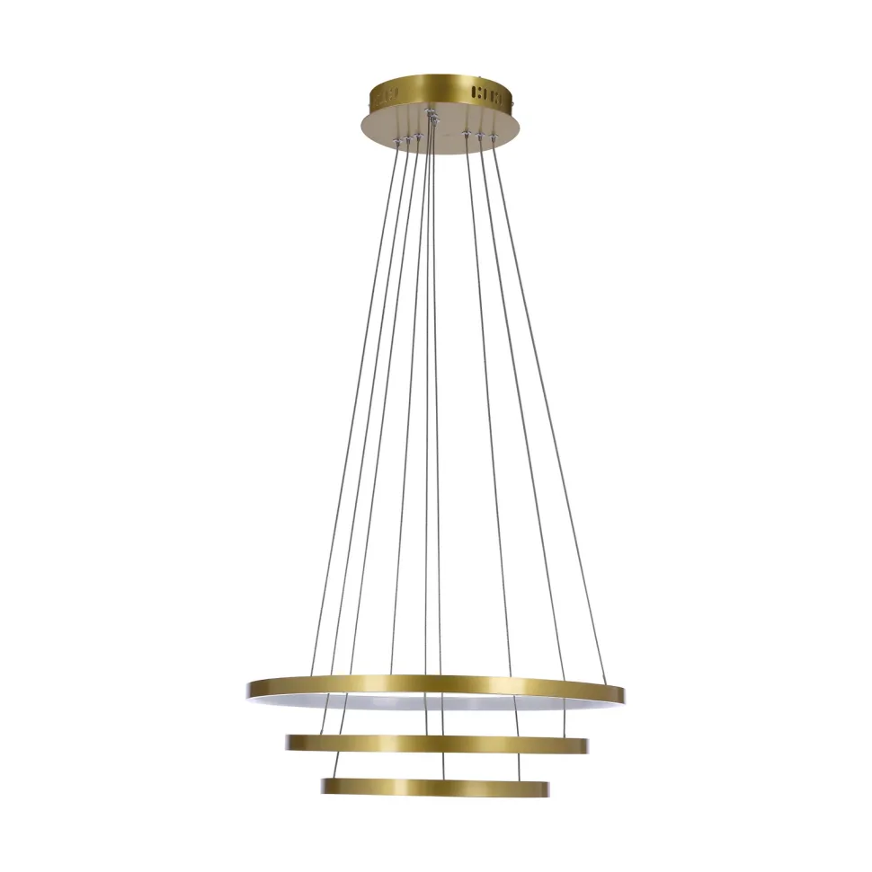 Wyjątkowy design Lampa wisząca Lune 50+40+30 przyciąga uwagę unikalną konstrukcją trzech złotych ringów. Każdy z nich współgra ze sobą, tworząc efektowną i nowoczesną kompozycję. Złote wykończenie nadaje wytworny charakter, idealnie komponując się z różnymi stylami wnętrz. Lampa ta zapewnia jednolite oświetlenie, tworząc przyjemną i komfortową atmosferę. Jest doskonałym wyborem do salonu, jadalni czy sypialni, pełniąc zarówno funkcję praktyczną, jak i dekoracyjną.