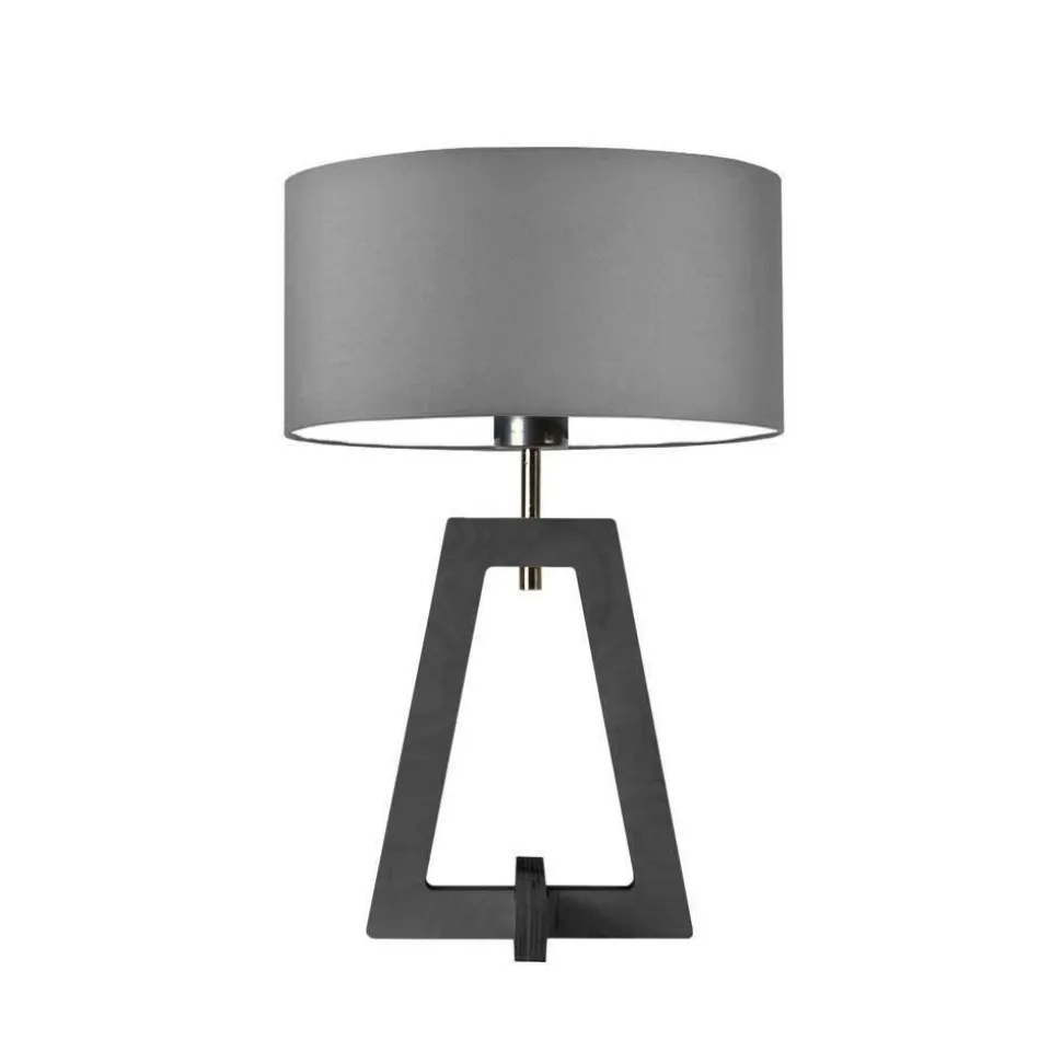 Lampka Clio wyróżnia się ciekawą konstrukcją, tworzoną przez podstawę w kształcie trapezu i tkaninowy abażur.