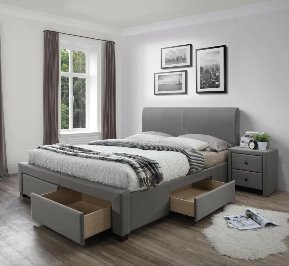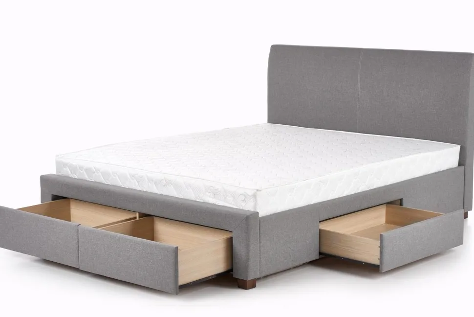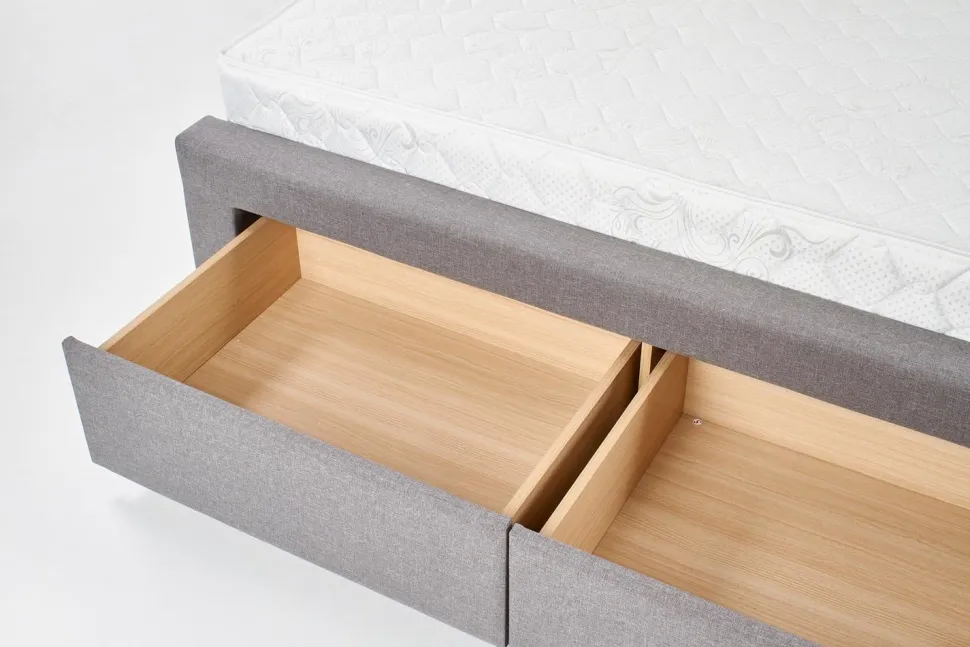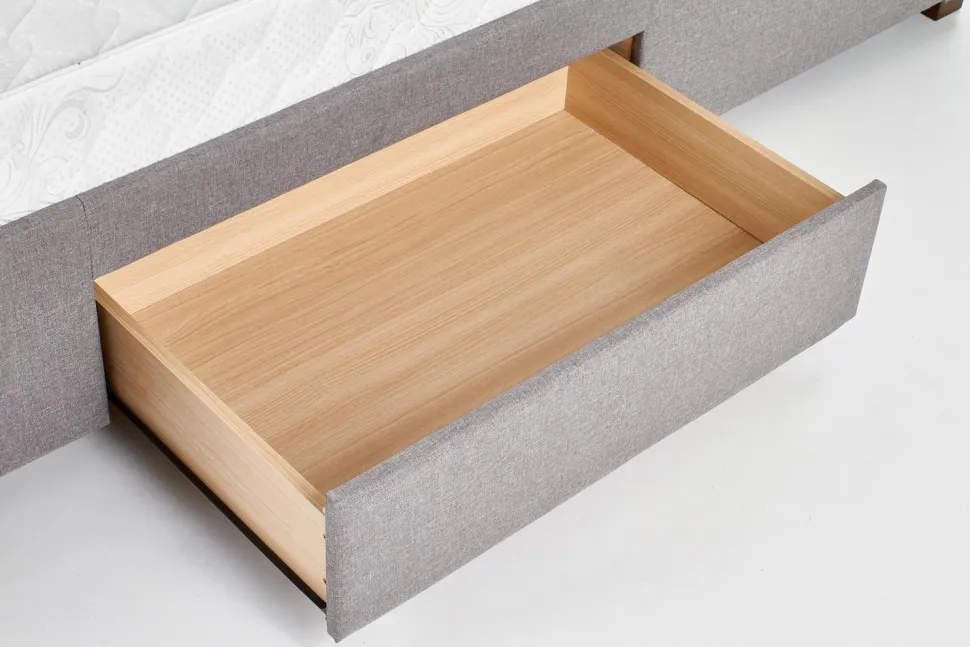 Łóżko Diana to nowoczesny mebel wykonany z drewna i tkaniny w kolorze popielatym, wyróżnia się szczególną trwałością oraz stabilnością. Natomiast praktyczne szuflady zwiększają funkcjonalność łóżka, umożliwiając praktyczne przechowywanie pościeli i innych rzeczy. Estetyczny wygląd łóżka zachwyci każdego, kto stawia na designerski styl w aranżacji wnętrz. Doskonale sprawdzi się w sypialni, jak również w eleganckim pokoju hotelowym. Wybierz mebel, który zadowoli Twoje wymagania i zadbaj o swoje wygodne miejsce do snu!