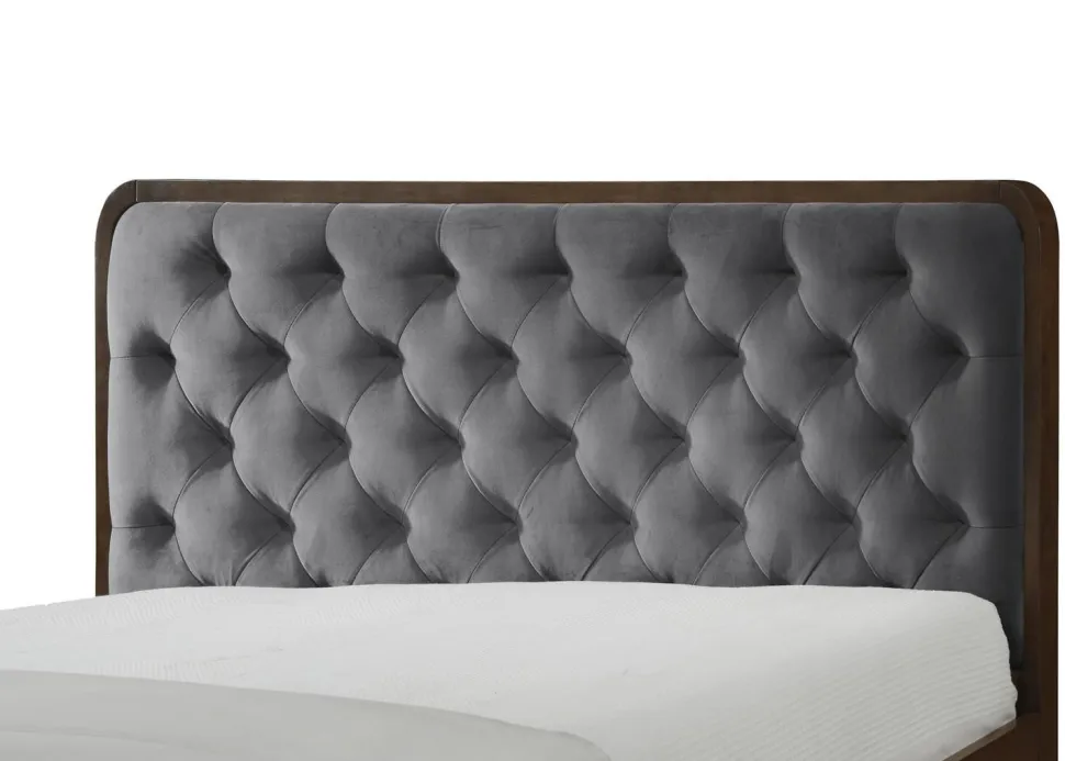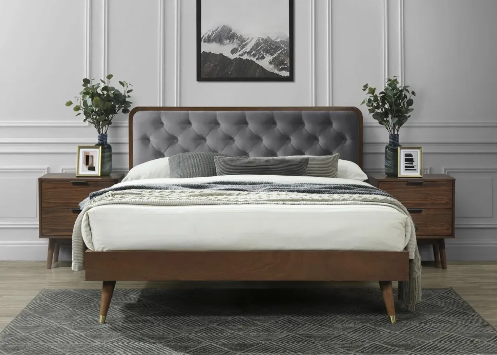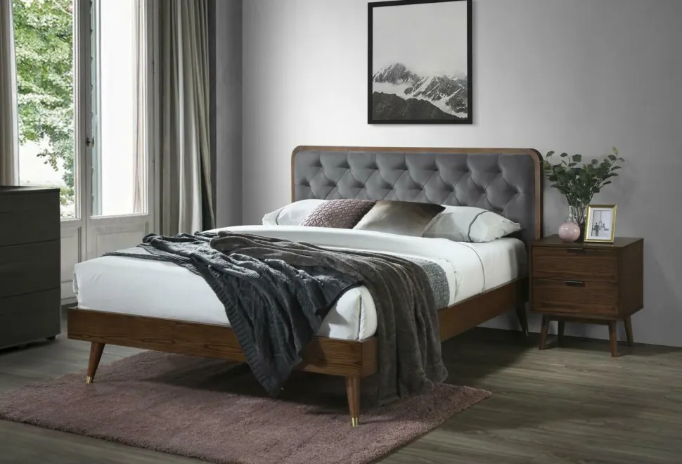 - Łóżko Disy to eleganckie połączenie tkaniny o popielatym kolorze i drewna w odcieniu orzecha, które dodaje wnętrzu sypialni wyjątkowego uroku.