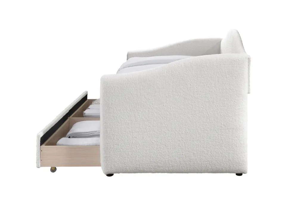 - Łóżko Elbert wyróżnia się nowoczesnym i eleganckim wyglądem, dzięki tkaninie boucle w kremowym kolorze