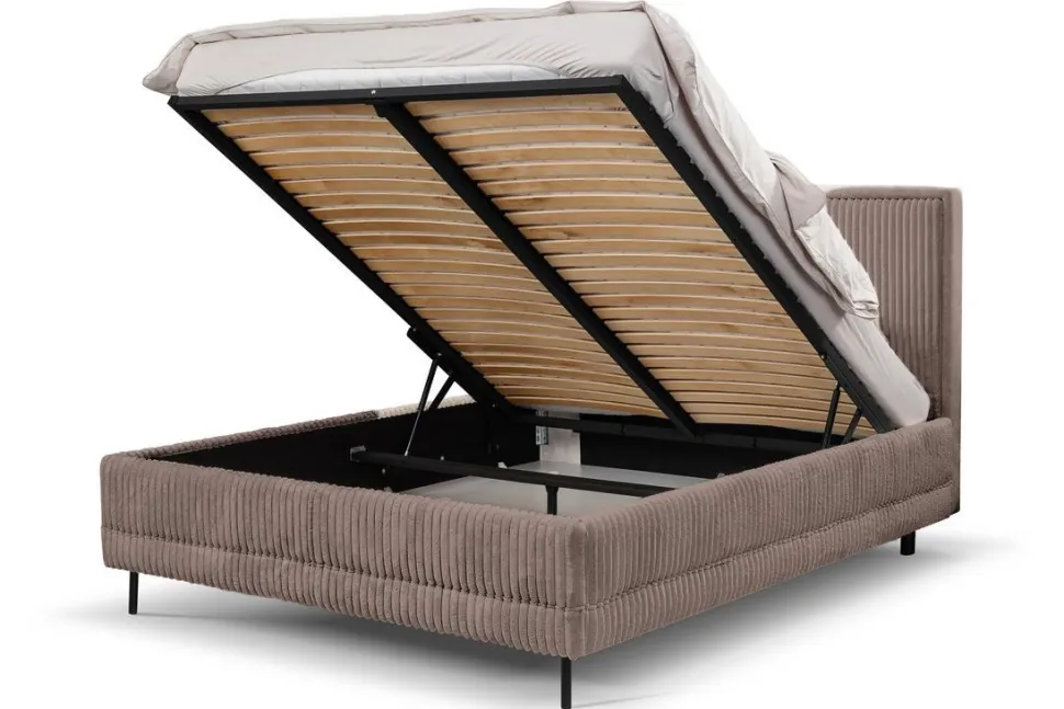 - Łóżko wyposażone jest w praktyczny stelaż z podnośnikiem i pojemnikiem na pościel.