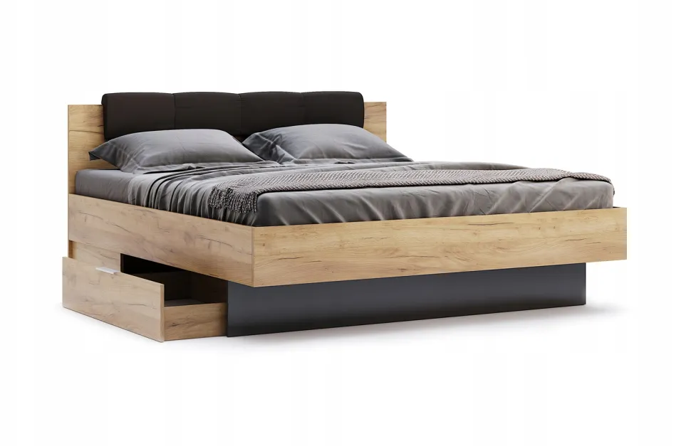 Łóżko Lana 160 cm z szufladami wyróżnia się nowoczesnym designem, który doskonale wpisuje się w trendy wystroju wnętrz. Minimalistyczna stylistyka, połączenie naturalnego drewna dębowego z eleganckim szarym wykończeniem, oraz harmonijne proporcje sprawiają, że jest to nie tylko mebel użytkowy, ale również atrakcyjny element dekoracyjny sypialni.