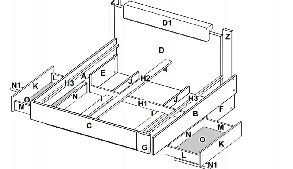 - Wnętrze łóżka zostało wyposażone w obszerne szuflady, zapewniające dodatkową przestrzeń na przechowywanie pościeli, ubrań czy innych niezbędnych przedmiotów
