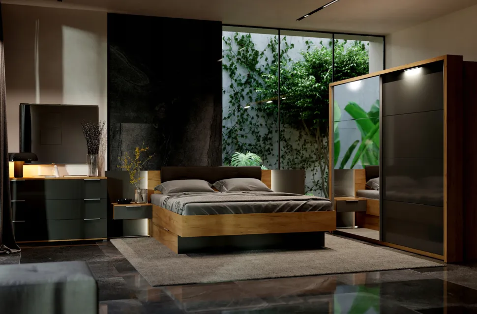 Łóżko Lana to nie tylko mebel do spania, to prawdziwa oaza komfortu i funkcjonalności w Twojej sypialni. Wyróżnia się nowoczesnym, minimalistycznym designem, który doskonale pasuje do każdej współczesnej sypialni. Kontrast między dębowym wykończeniem a szarością dodaje mu elegancji i charakteru.