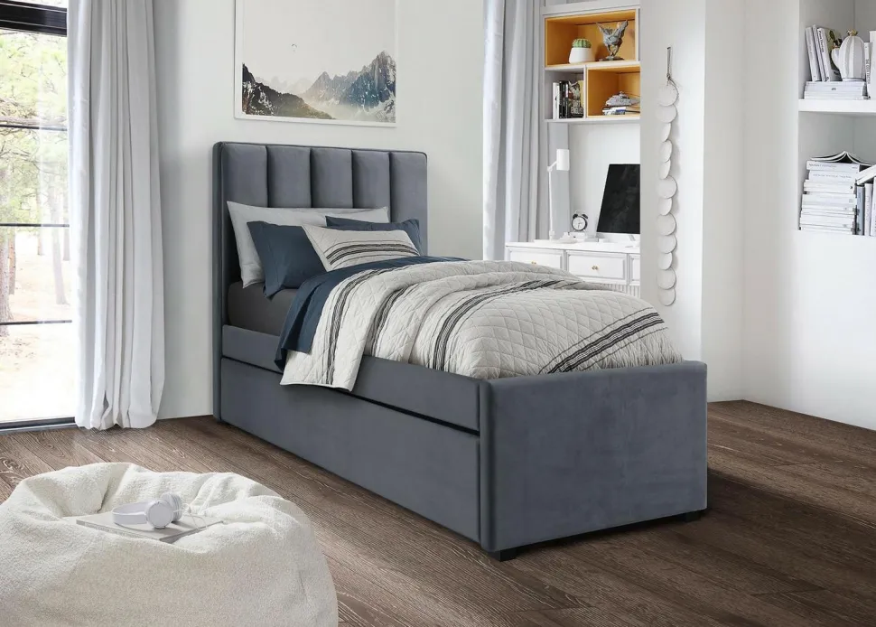 Łóżko pojedyncze Ovilea Velvet w kolorze szarym to eleganckie i funkcjonalne rozwiązanie do każdej sypialni. Wykonane z wysokiej jakości tkaniny velvet, łóżko charakteryzuje się nie tylko luksusowym wyglądem, ale również niezwykłą miękkością. Jego wymiary 96/221/122 cm zapewniają komfortową przestrzeń do spania dla jednej osoby, a wysuwany dolny materac pozwala na szybkie i wygodne przekształcenie łóżka w dwuosobowe. Popielaty kolor dodaje wnętrzu nowoczesnego i stylowego akcentu, doskonale komponując się z różnymi aranżacjami.