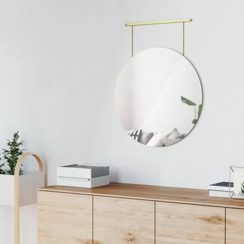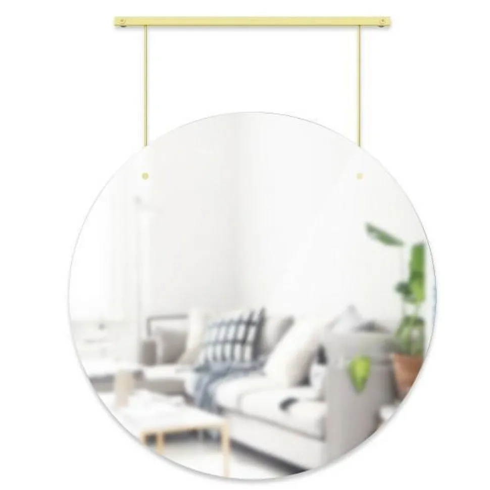 Jedyne w swoim rodzaju 24-calowe lustro zawieszone na pięknym metalowym drążku w złotym kolorze. Duży, okrągły kształt zwierciadła wnosi światło do Twojej przestrzeni, a jego nowoczesny design będzie ciekawym akcentem na każdej ścianie w domu. Lustro Exibit doskonale sprawdzi się w nowoczesnej łazience lub przedpokoju w stylu glamour. Lustro ścienne Exhibit jest dostarczane ze wszystkimi niezbędnymi elementami do bezproblemowej instalacji i może być używane w dowolnym pomieszczeniu w domu.Średnica lustra: 61 cm