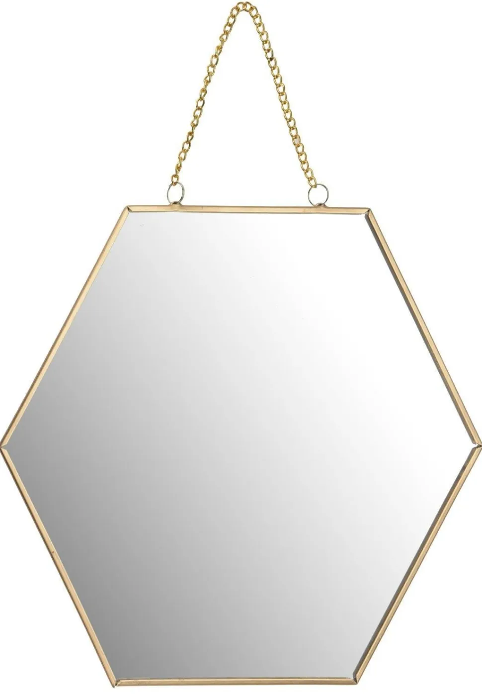 Hexa Gold w rozmiarze L to minimalistyczne lustro, które będzie pasować do wielu wnętrz i aranżacji. Sześciokątne, srebrne zwierciadło otacza metalowa rama w kolorze złotym. Całość zawieszona jest na delikatnym, złotym łańcuszku. Lustro Hexa to stylowa ozdoba do salonu, sypialni a także łazienki. Wpisuje się w najnowsze trendy, a dzięki prostemu, klasycznemu designowi nigdy nie wyjdzie z mody.