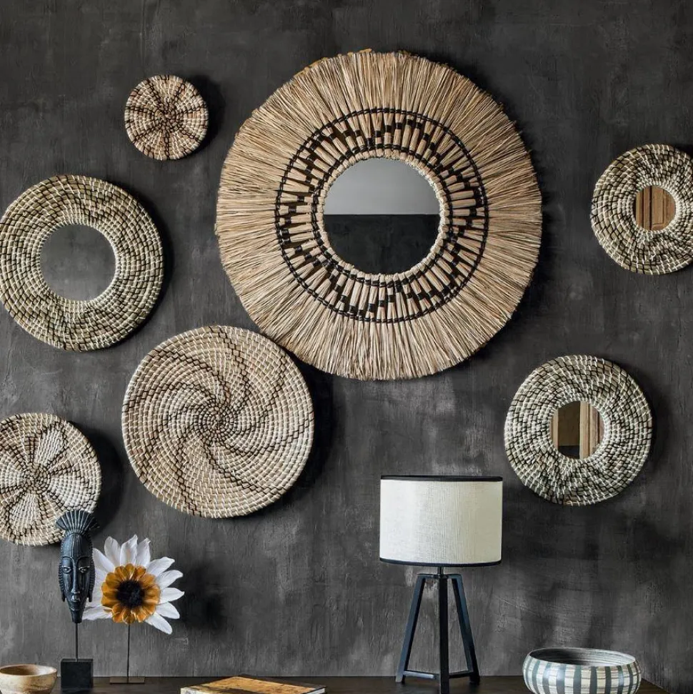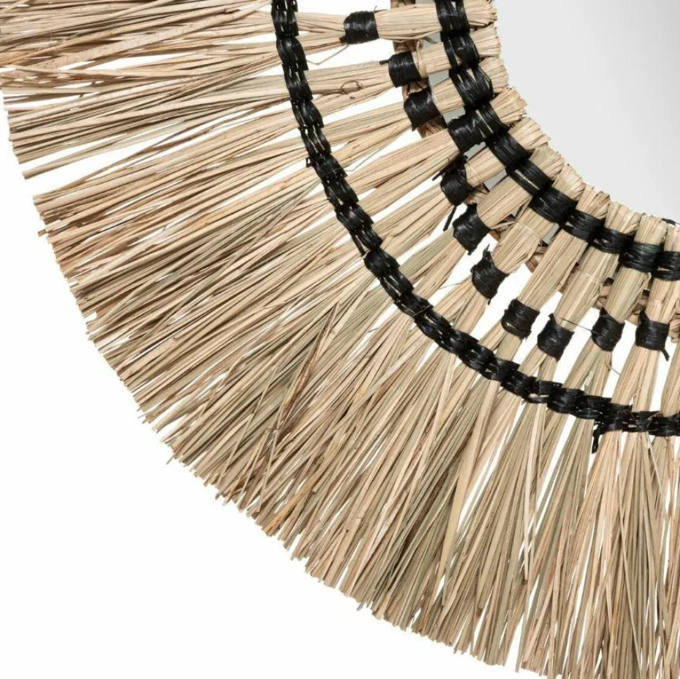 Orientalne lustro Isa składa się z ramy wykonanej z naturalnej trzciny oraz lustra o średnicy 30cm. Lustro, które ma okrągły kształt, zostało ozdobione czarnymi nićmi, które regularnie przeczesują trzcinę, tworząc przy okazji orientalne wzory.