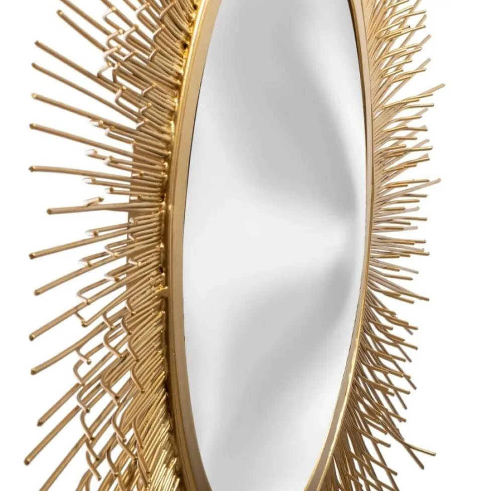Okrągłe lustro z metalową ramą w kolorze złotym, która przypomina promienie słońca, doda nowoczesnego akcentu do pustej ściany w każdym pomieszczeniu. Rama wykonana jest z lakierowanego metalu. Natomiast tył, na którym zamontowane jest lustro oraz uchwyty montażowe to solidna płyta MDF.