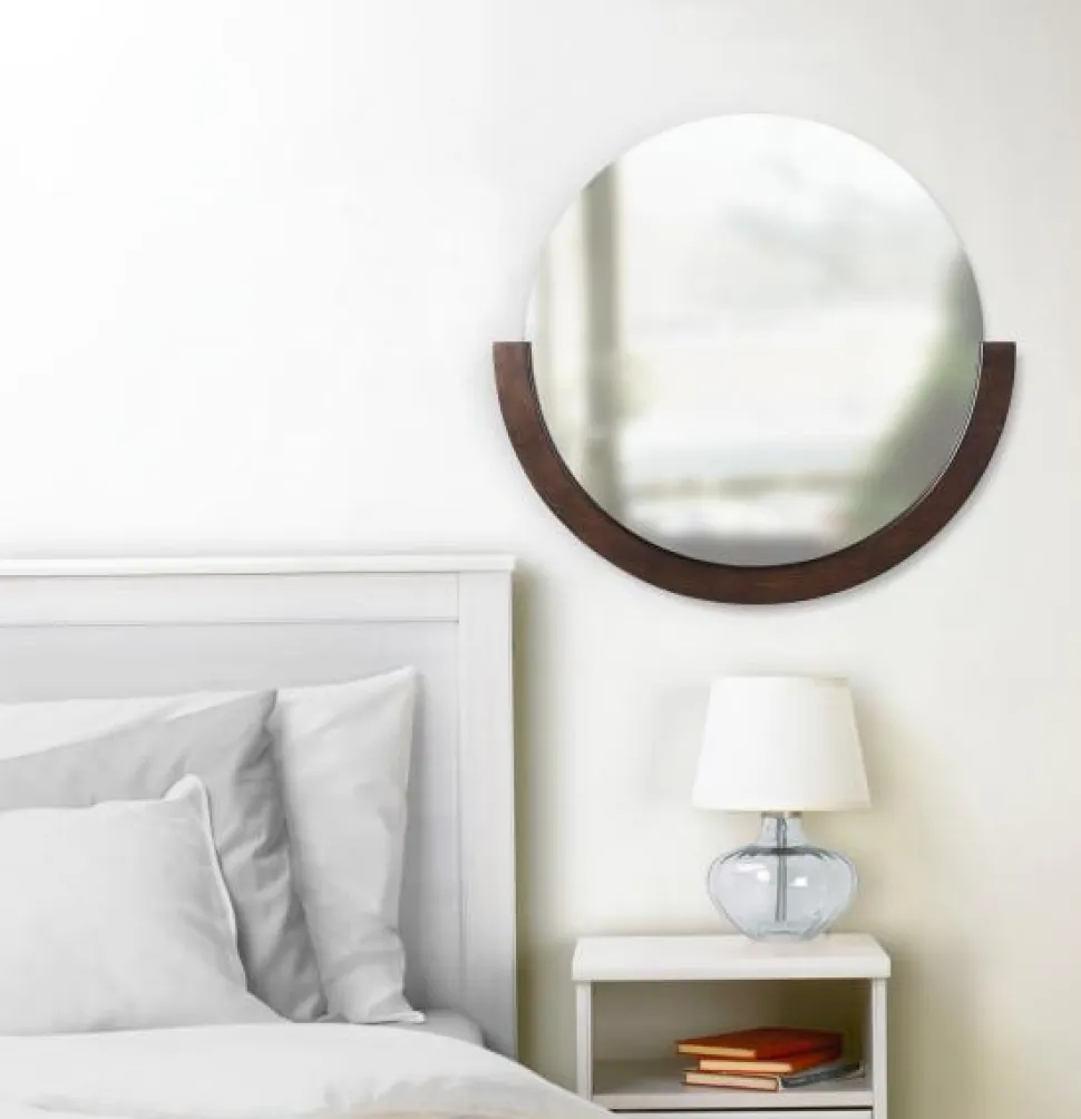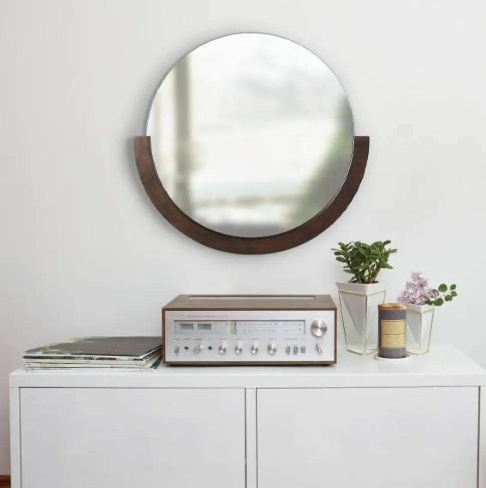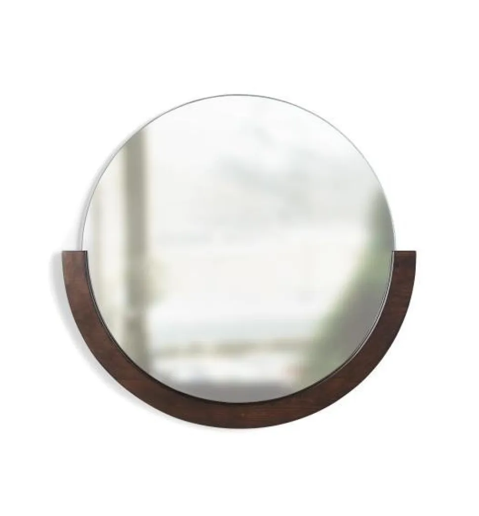 Jeśli szukasz nowoczesnego i przyjemnego lustra, Mira może być idealnym elementem dekoracji do Twojego domu. To okrągłe lustro ma drewnianą półkolistą ramę z ciepłym drewnianym wykończeniem. Jeśli chcesz, aby pomieszczenie wydawało się większe, lustro idealnie odbija światło po całym pomieszczeniu. Górna połowa tego okrągłego lustra jest bezramowa, dzięki czemu wydaje się on lekką i nieprzytłaczającą ozdobą. To wszechstronne lustro świetnie wygląda jako lustro w przedpokoju, lobby lub sypialni. Mira to również doskonały prezent na parapetówkę. Wymiary opakowania: 90x88x8 cm