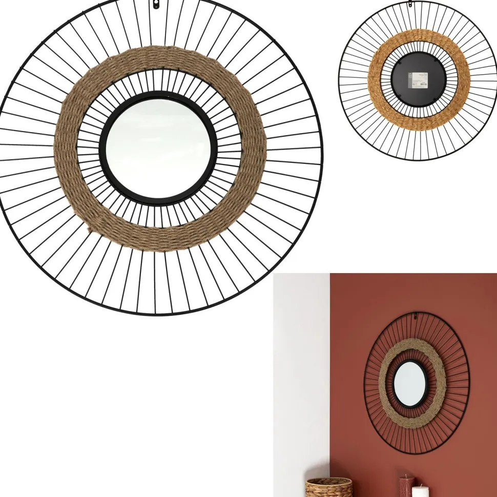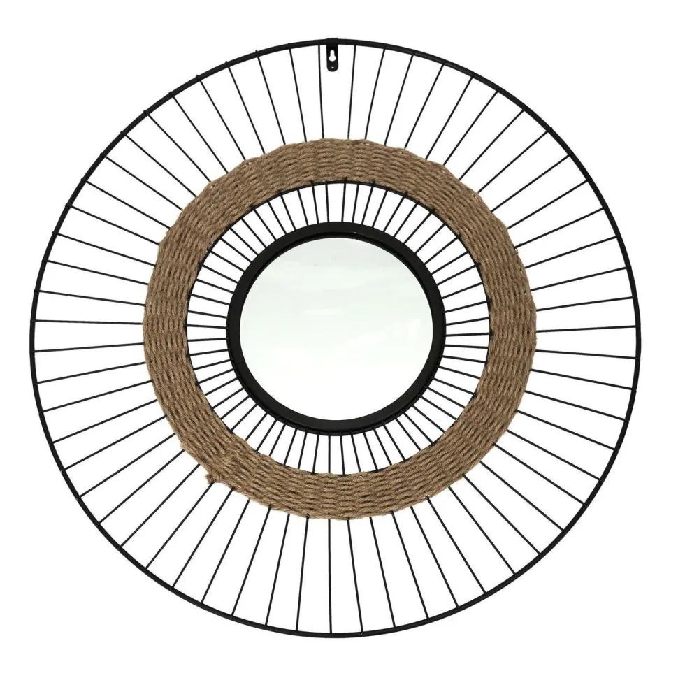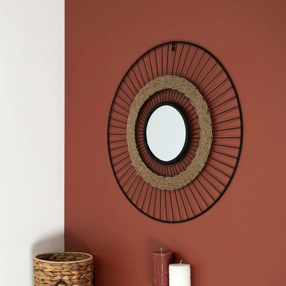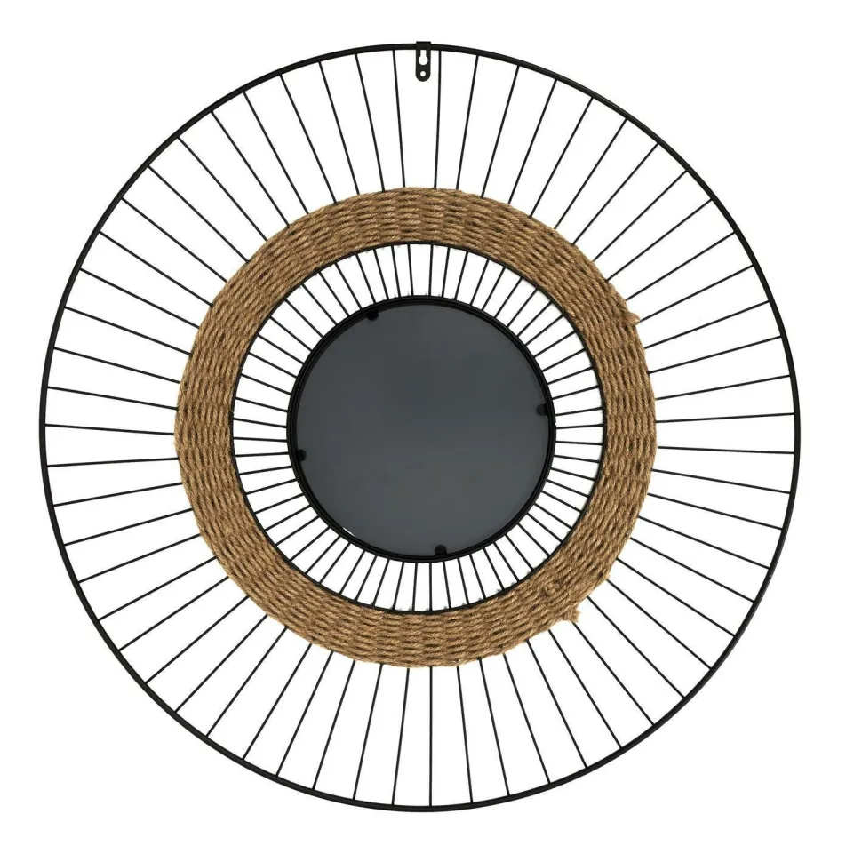 Minimalistyczne lustro o metalowej industrialnej ramie, łączy w sobie cechy nowoczesności z nutą klimatu boho. To niecodzienne połączenie tworzy wyjątkowy efekt. Wszystko dzięki ozdobnej słomianej plecionce, która przełamuje surowy wygląd metalowej ramy. Okrągłe zwierciadło lustra ukryte zostało w ramie, przypominającej koło roweru. „Szprychy” lustra zostały pomalowane na czarno. Intensywna czerń doskonale balansuje z naturalnym kolorem słomianej plecionki. Lustro posiada haczyk do powieszenia go na ścianie. Miremba będzie świetnym urozmaiceniem w przedpokoju, sypialni lub salonie. Te pozornie niepasujące do siebie elementy tworzą zdyscyplinowaną i oryginalną całość, dzięki której konstrukcja Miremba wpasuje się we wnętrza zarówno o stylistyce loftowej, jak i stylistyce boho.