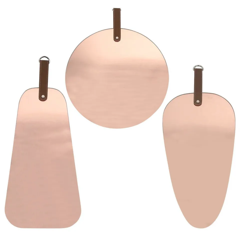 Lustro Pagaj jest bardzo modnym dodatkiem w kolorze miedzianym. Lustro możemy zawiesić na ścianie dzięki uchwytowi zrobionemu z paska z eko skóry zakończonego stalowym uchwytem. Uchwyt został zamocowany do lusterka za pomocą nitu. Na pasku dodatkową ozdobą są jasne przeszynia. Lustro jest w kształcie przypominającym trójkąt z zaokrąglonymi rogami.