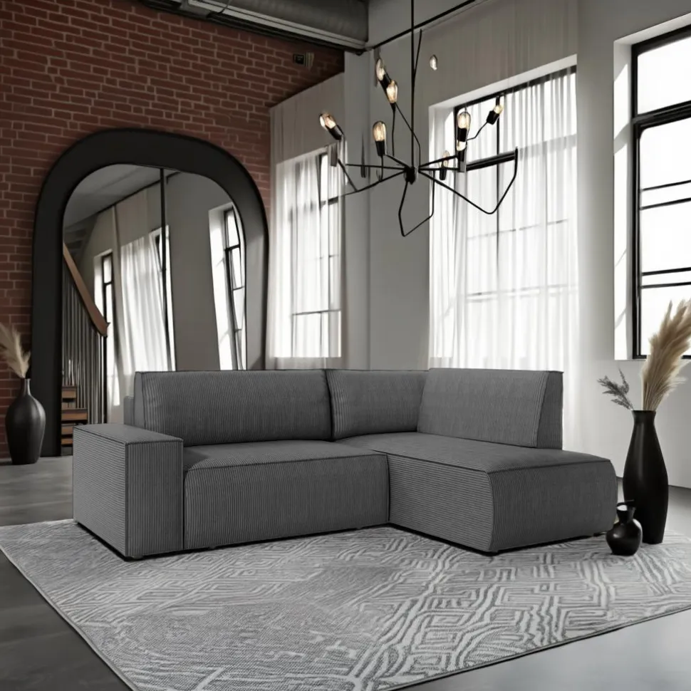 Narożnik Molde L prawy w sztruksowym szarym wykończeniu to idealne połączenie wygody i stylu. Jego minimalistyczny design sprawia, że pasuje do każdego wnętrza, a ciekawy materiał dodaje mu niepowtarzalnego charakteru. Sofę możemy łatwo rozłożyć do powierzchni spania o wymiarach 200×135 cm, co czyni go niezwykle praktycznym meblem do codziennego użytku. Dodatkowo, narożnik wyposażony jest w pojemnik na pościel, co pozwala na utrzymanie porządku w salonie.