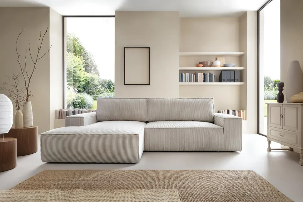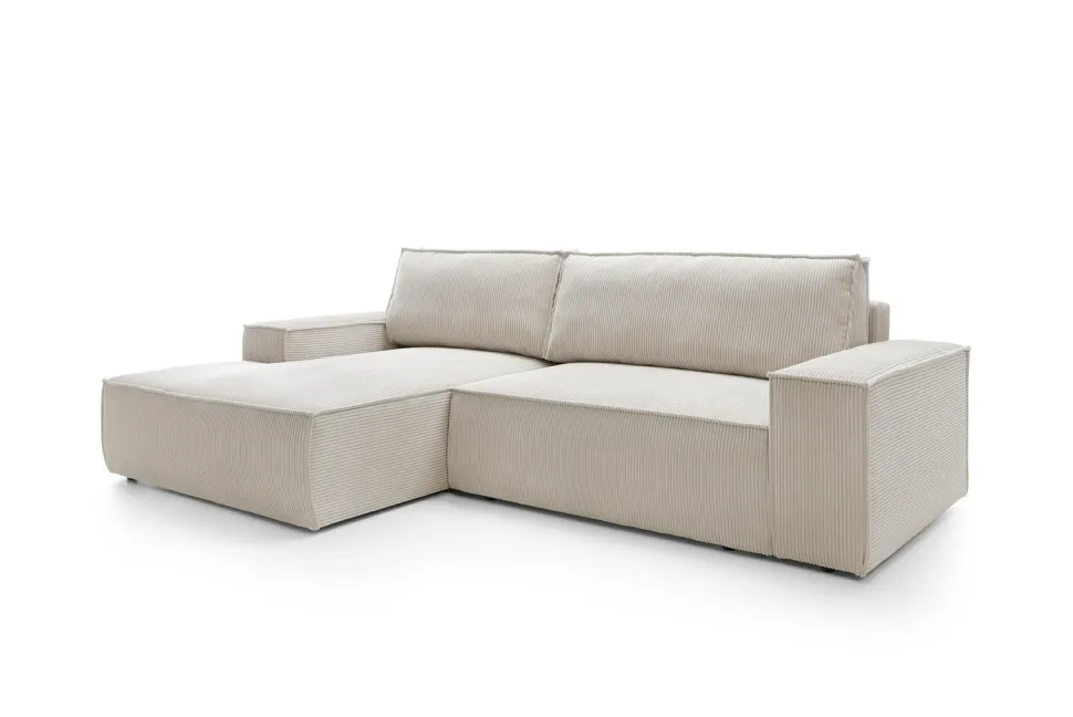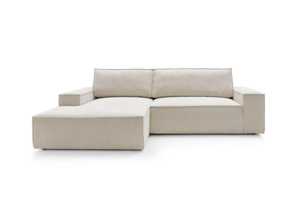 - Kolor beżowy i minimalistyczny design sprawiają, że narożnik ten doskonale wpasuje się w każde wnętrze.