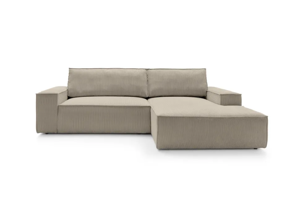 Narożnik Molde M prawy ciemny beżowy Poso 02 to mebel, który łączy w sobie elegancję, wygodę i funkcjonalność. Dzięki zastosowaniu najwyższej jakości materiałów, jak sztruksowa tkanina Poso, pianka tapicerska, metal, płyta i tworzywo sztuczne, jest niezwykle trwały i odporny na uszkodzenia. Wyposażony jest w praktyczny pojemnik na pościel oraz wygodne podłokietniki.